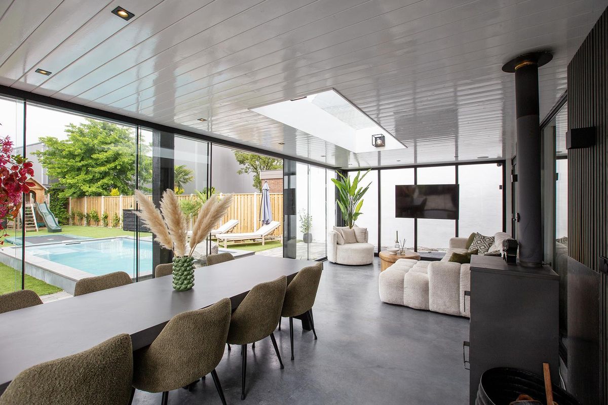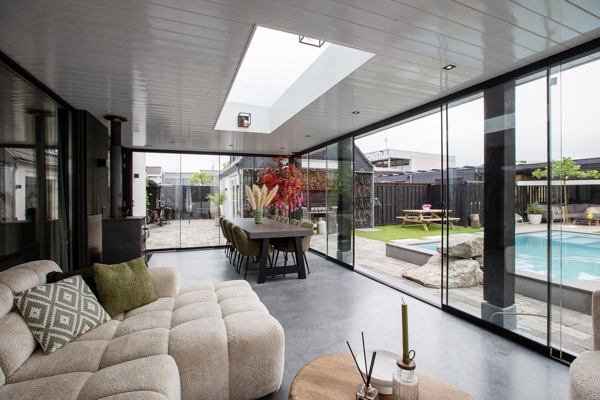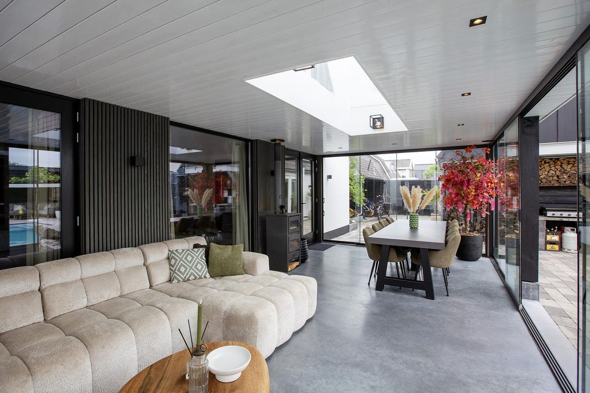 Via de woonkamer loop je door naar de uitbouw, waar wederom een zit- én eethoek is gecreëerd; ideaal als tweede leefruimte of plek om te ontspannen met uitzicht op het groen.
