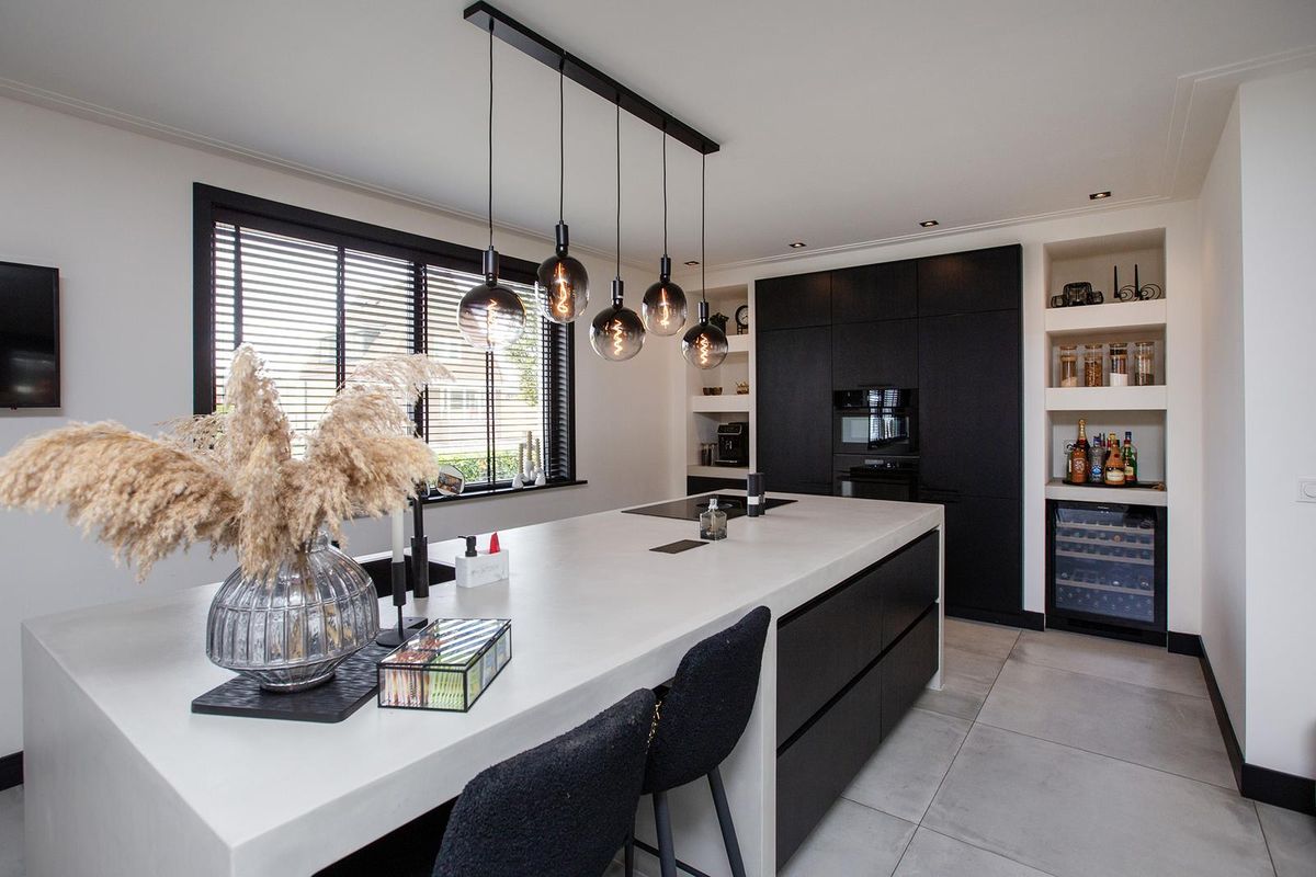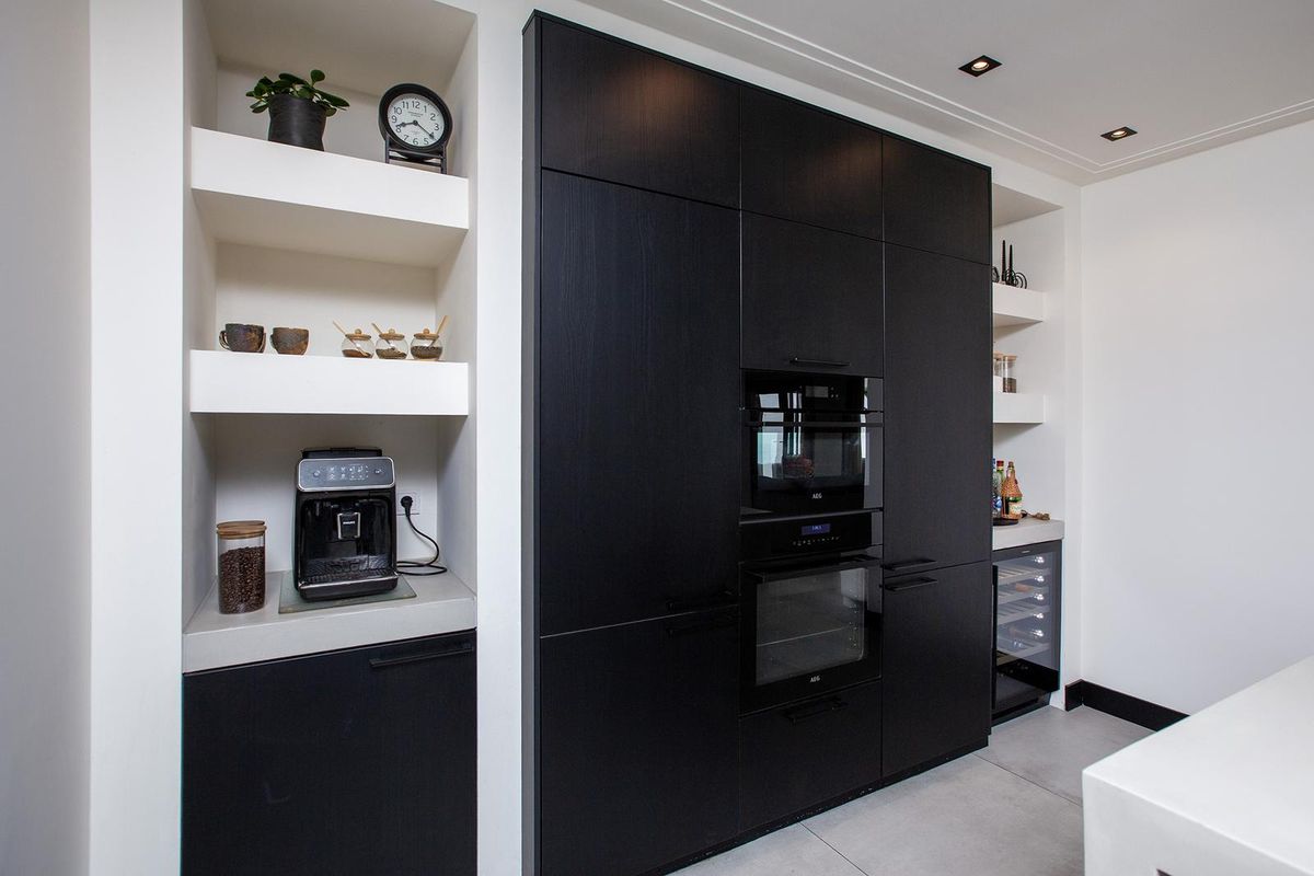 De keuken is voorzien van hoogwaardige inbouwapparatuur, waaronder: inductiekookplaat met geïntegreerde afzuigkap, koelkast én aparte vrieskast, wijnkoeler, combi-oven, riante opbergruimte voor keukenapparatuur.