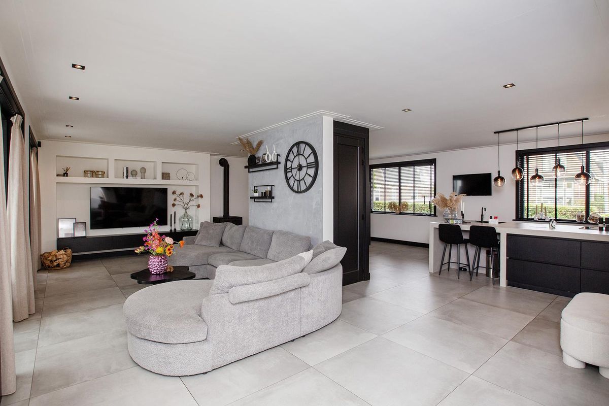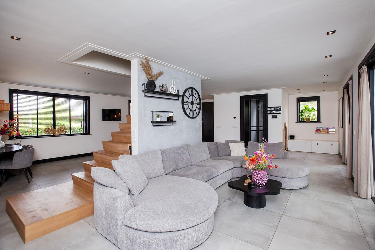 Grenzend aan de keuken vind je een knusse eethoek voor gezellige diners. De open woonkamer heeft een grote raampartij waardoor er veel daglicht binnenvalt en biedt een comfortabele zithoek met uitzicht op de tuin.
