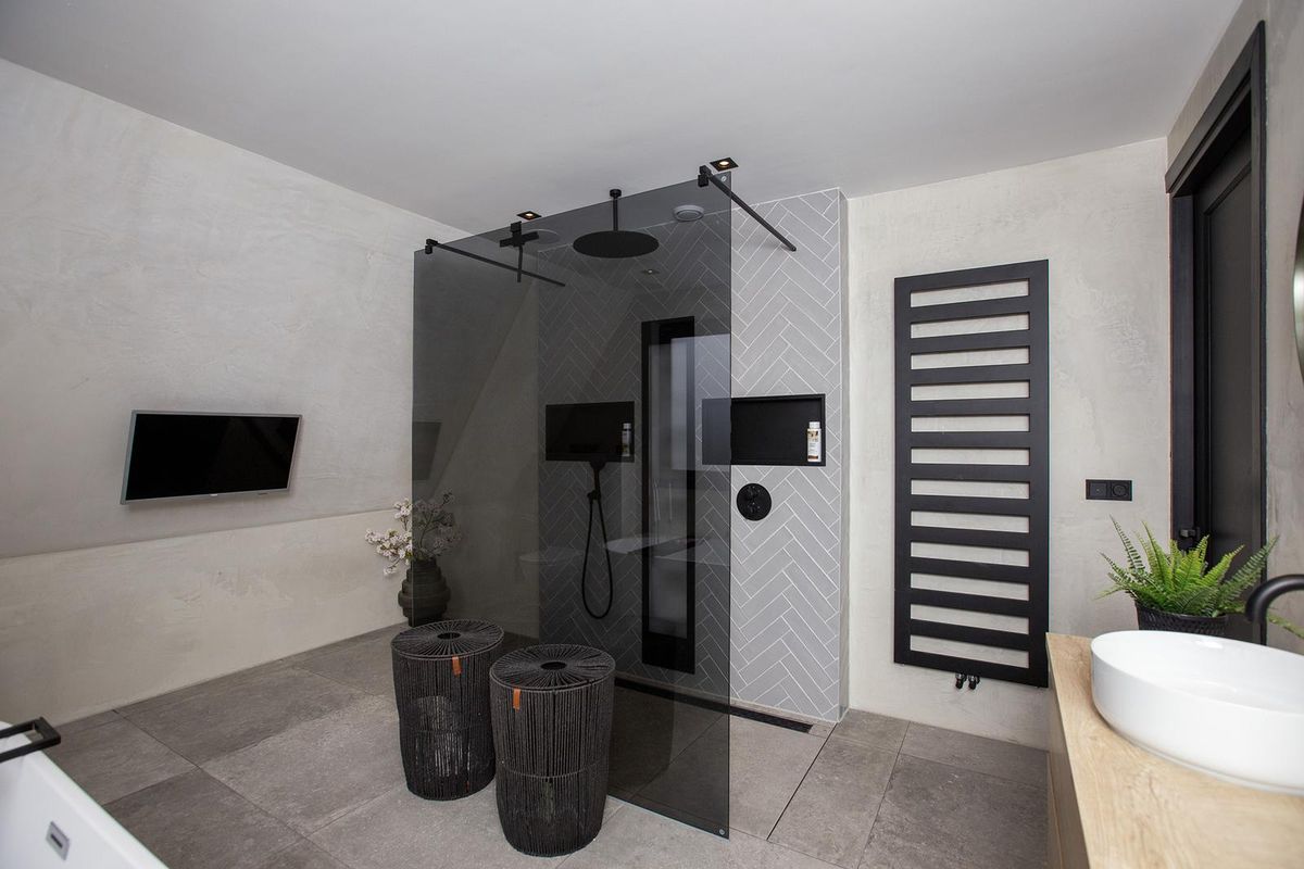 Er is een ruime badkamer voorzien van een inloop regendouche, dubbele wastafel met meubel, ligbad en handdoekradiator.