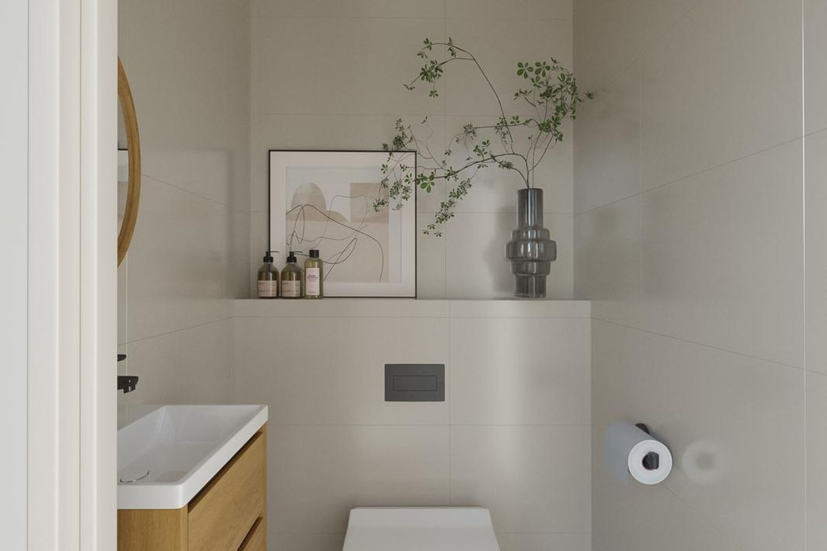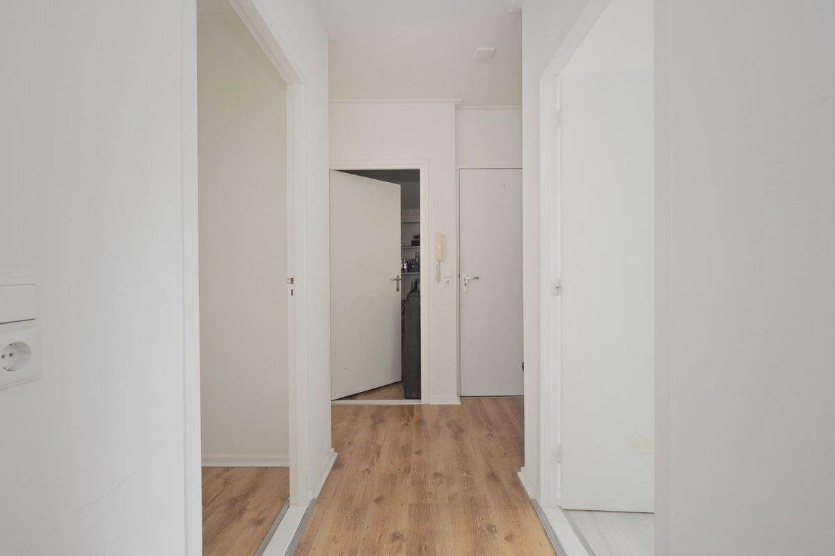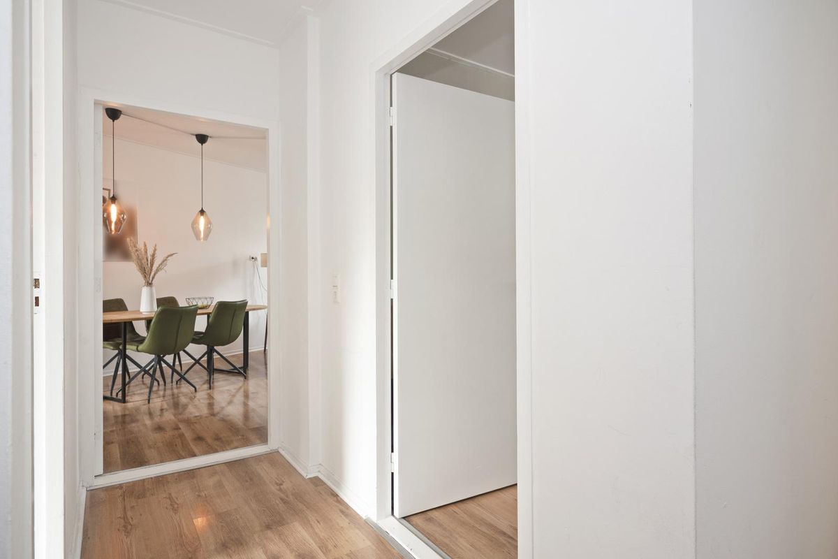 Achter de voordeur is de hal die toegang biedt tot alle ruimtes van het appartement. Dit zijn de woonkamer met open keuken, beide slaapkamers, de badkamer, een aparte toiletruimte en een inpandige berging/wasruimte. Die laatste ruimte is erg fijn, want zo hoeven de wasmachine en droger niet in de keuken of badkamer te staan!