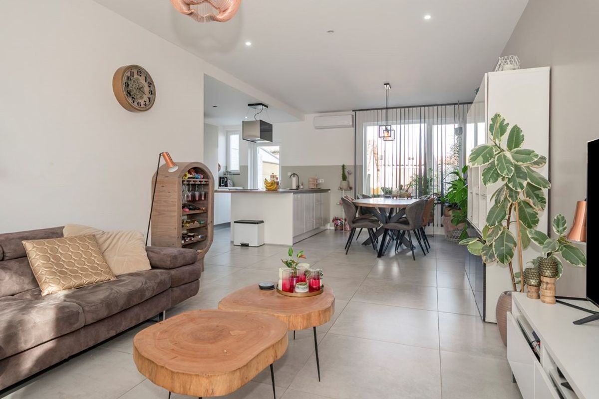 Hal, toilet, sfeervolle en lichte woonkamer (voorzien van een airco-unit) met open keuken.