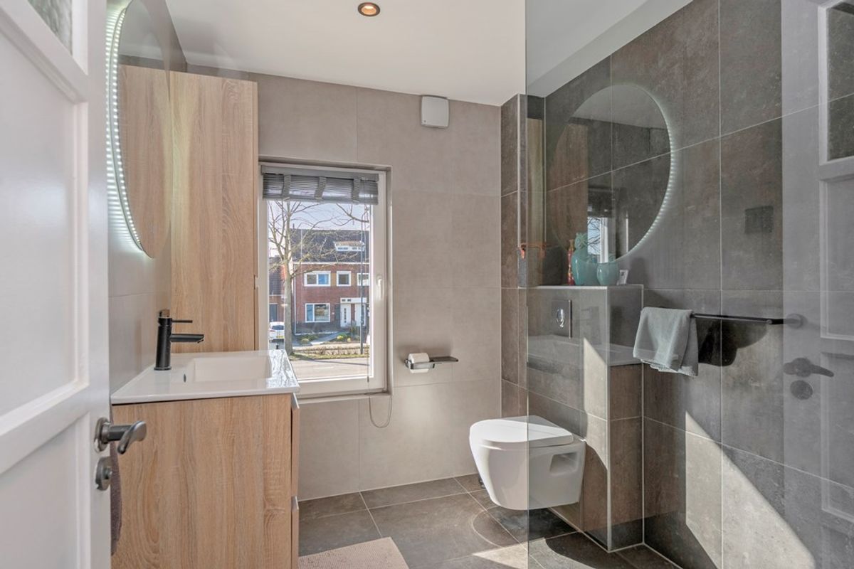 De moderne badkamer (2023) is voorzien van: een inloopdouche, wastafel met opbergmeubel en een toilet.