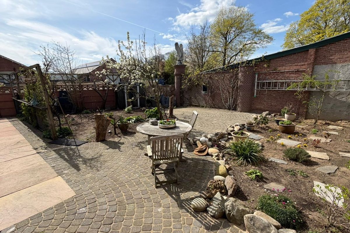 De tuin is ruim en veelzijdig, en via twee poorten toegankelijk.