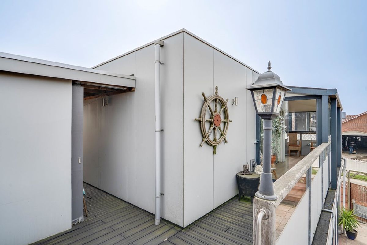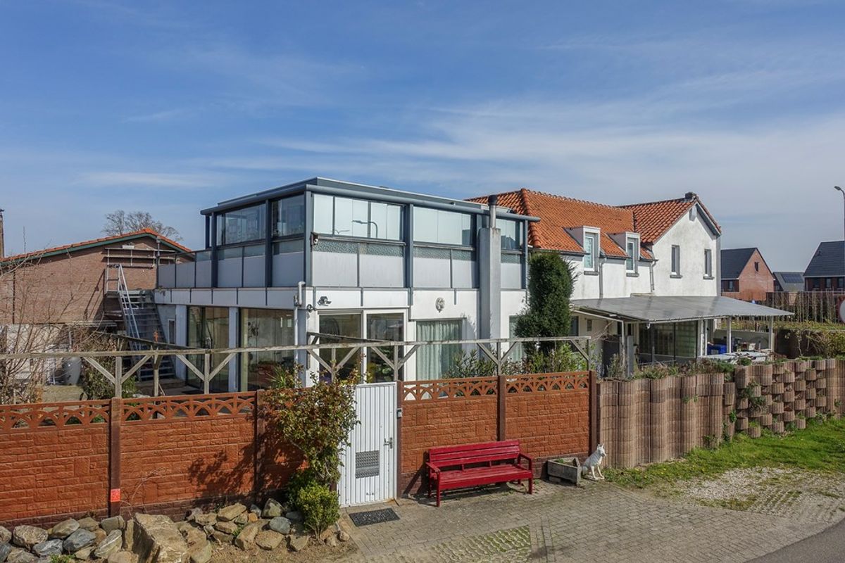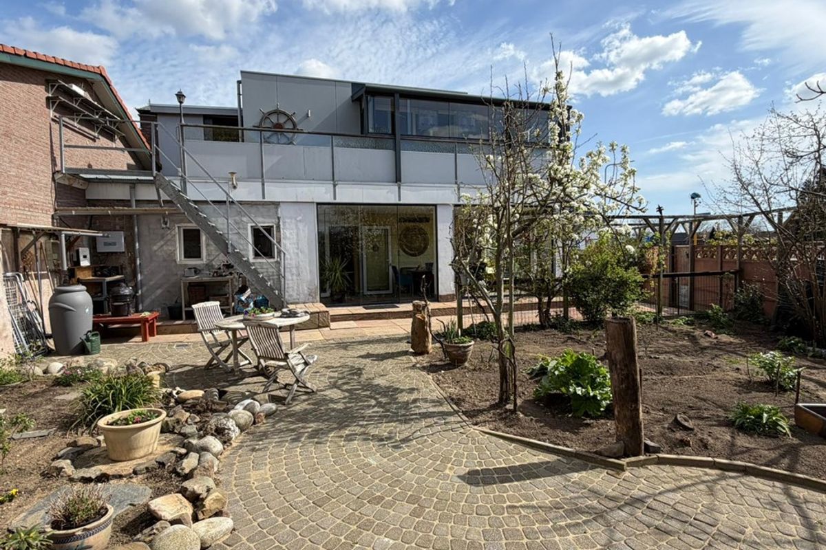 Via de looppoort, ter hoogte van de serre, bereik je eenvoudig de hoofdwoning en de trap naar het appartement. De dubbele poort aan de achterzijde biedt toegang tot een gedeelte waar momenteel ruimte is voor minimaal één auto, maar dat zich uitstekend leent voor verdere invulling naar eigen wens.
