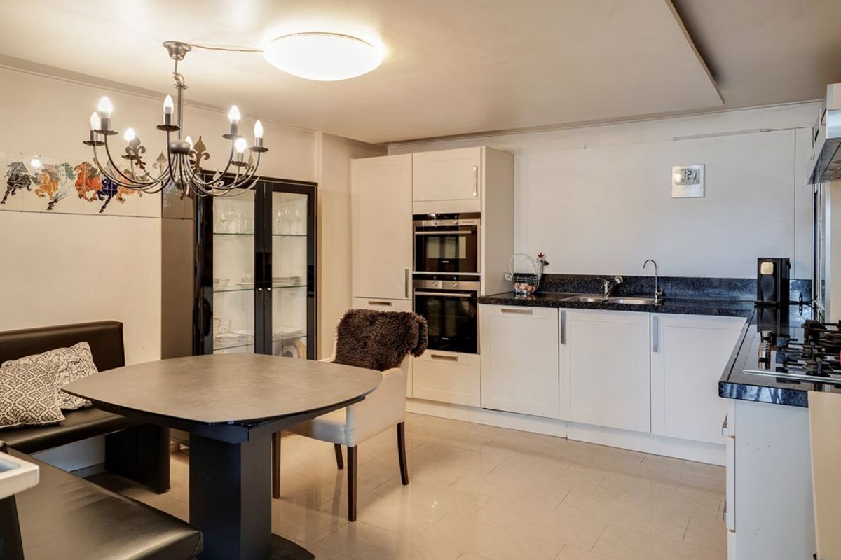 De woonkamer, met een royale oppervlakte van circa 44 m², nodigt uit tot samenzijn. De houthaard zorgt voor warmte en sfeer, terwijl de open verbinding met de halfopen keuken het geheel luchtig en ruimtelijk maakt. De keuken zelf is eveneens royaal opgezet (ca. 15 m²) en van alle gemakken voorzien.