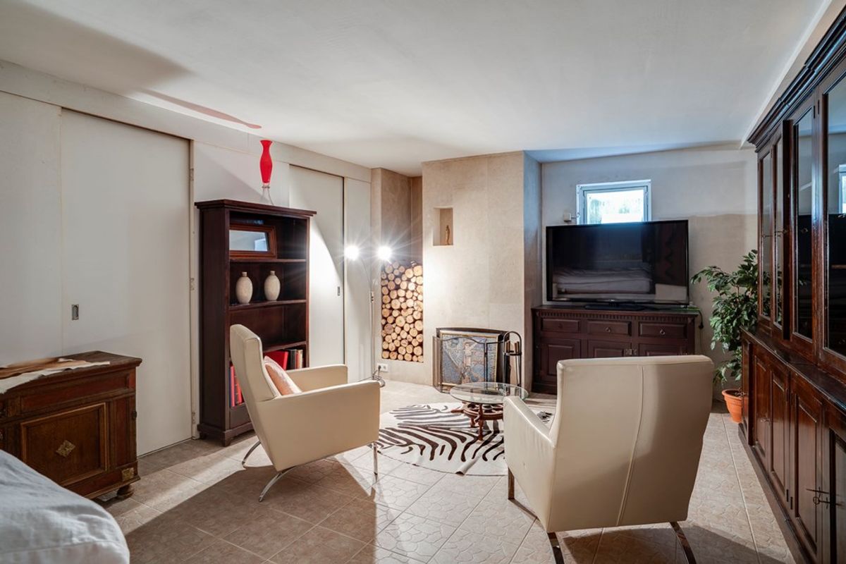 Hier bevindt zich de wellnessruimte: een warme, ontspannen omgeving met sauna, jacuzzi, douche en toilet. De open haard zorgt voor sfeer, terwijl de royale opzet ruimte biedt om echt tot rust te komen. Dit is geen standaard kelder, maar een volwaardige leefruimte gericht op comfort en ontspanning.