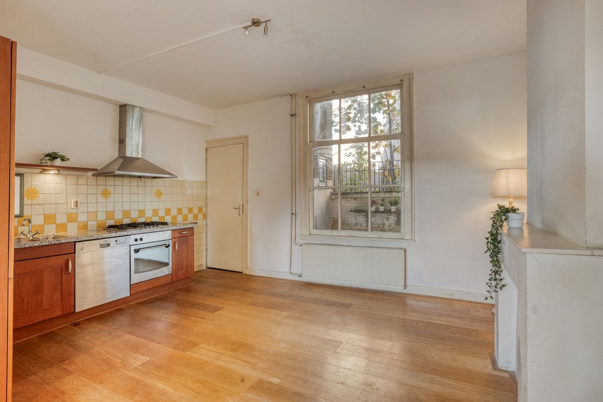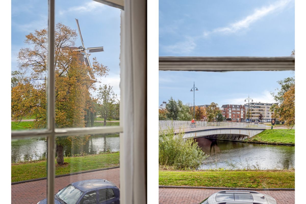 Overloop met de trap naar de 2e verdieping. Aan de achterzijde van deze unieke woning bevindt zich wederom een woonkeuken voorzien van een keukenblok met design afzuigkap en (inbouw) apparatuur. Extra opbergruimte vindt u in de trapkast. Via een doorloop bereikt u de badkamer met wastafel, toilet en een radiator. Het is tevens mogelijk om hier een doucheruimte te creëren. De L-vormige kamer aan de voorzijde van de woning maakt deze woning extra bezichtigingswaardig. Wat een geweldig uitzicht op o.a. de singel en molen De Valk heeft u vanuit deze kamer! Het is zeer aannemelijk dat u deze kamer zult gaan gebruiken als woonkamer.