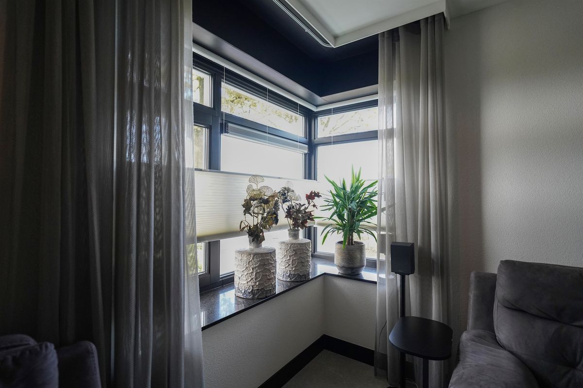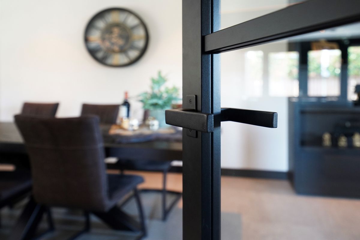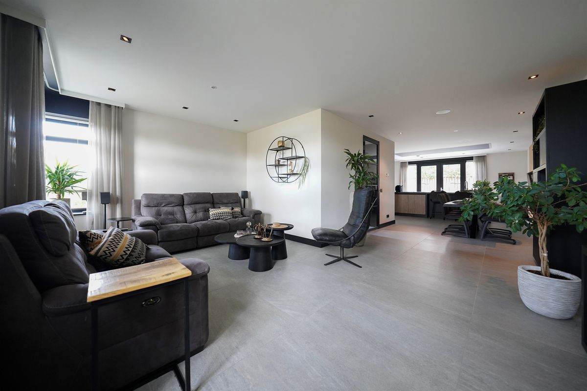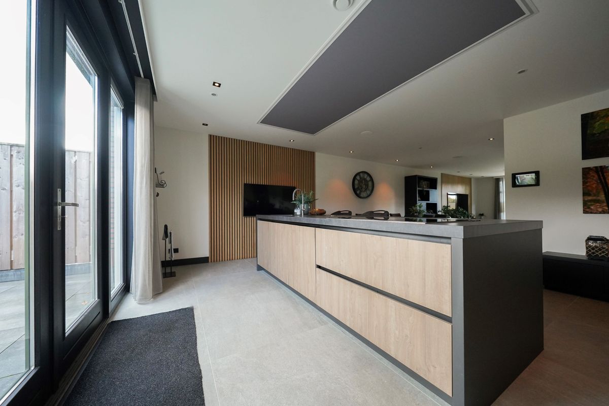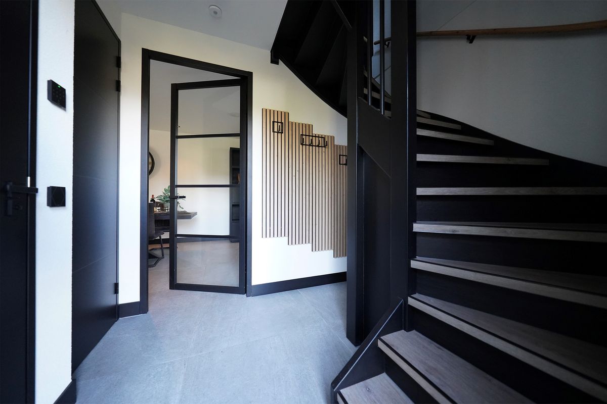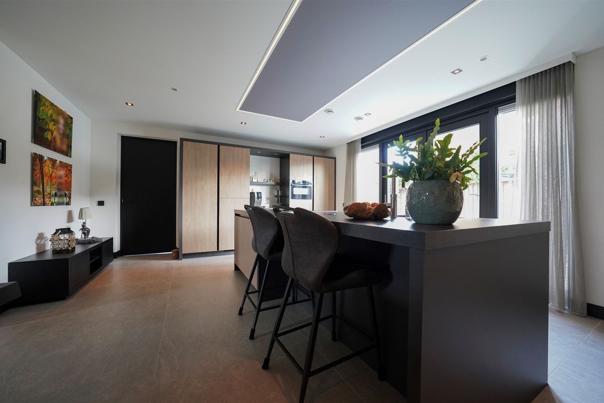 Bij aankomst valt mij meteen die vrije ligging op waarbij de woning op een hoek gelegen is en je volledige privacy hebt. Heel fijn! We kunnen ruim parkeren op eigen terrein en als ik dat eenmaal gedaan heb en de woning bekijk valt het me nu pas op hoe hoog deze woningen zijn. Ik kan je vertellen dat de woning zelfs 4 verdiepingen heeft! De uitstraling van de woning vind ik prachtig met mooi metselwerk, een gebroken kap en gebruik van goede kleuren. De hoofdentree is aan de zijgevel gesitueerd en ook de aanbouw heeft een eigen entree aan deze zijgevel. Praktisch! Ik kom binnen in een goede hal waarbij me meteen opvalt dat de afwerking van de trap en de deuren matzwart zijn afgewerkt. Geen standaard witte nieuwbouwdeuren dus! De uitstraling is meteen heel chique en het gebruik van de mooie grote tegels op de vloer versterken deze uitstraling. Meteen links is de toiletruimte gesitueerd. Bij binnenkomst gaat de verlichting automatisch aan en uiteraard is deze ruimte voorzien van een hangend toilet en een fonteintje. We lopen door naar de living en de woonkeuken waarbij deze 2 ruimtes van elkaar gescheiden zijn door de hal in het midden. De meeste ideale indeling als je het mij vraagt. Bij binnenkomst valt meteen op wat een heerlijke ruimtes het zijn. De woonkamer is aan de voorzijde gelegen en heeft het vrije uitzicht over de straat, de wadi en de stationsstraat. Het hoekraam is daarbij een mooie eyecatcher. Het plafond is volledig voorzien van een spanplafond waardoor de akoestiek ook perfect is in de woonkamer en de keuken. De keuken is ook echt een eyecatcher. Zo’n eiland is de droom van iedere huizenbezitter denk ik. En wat voor een eiland! Aan werkruimte geen gebrek en de vaste kastenwand is daarbij ook echt ideaal. Bijna de volledige achtergevel is voorzien van glas en via de openslaande tuindeuren loop je zo de tuin in.