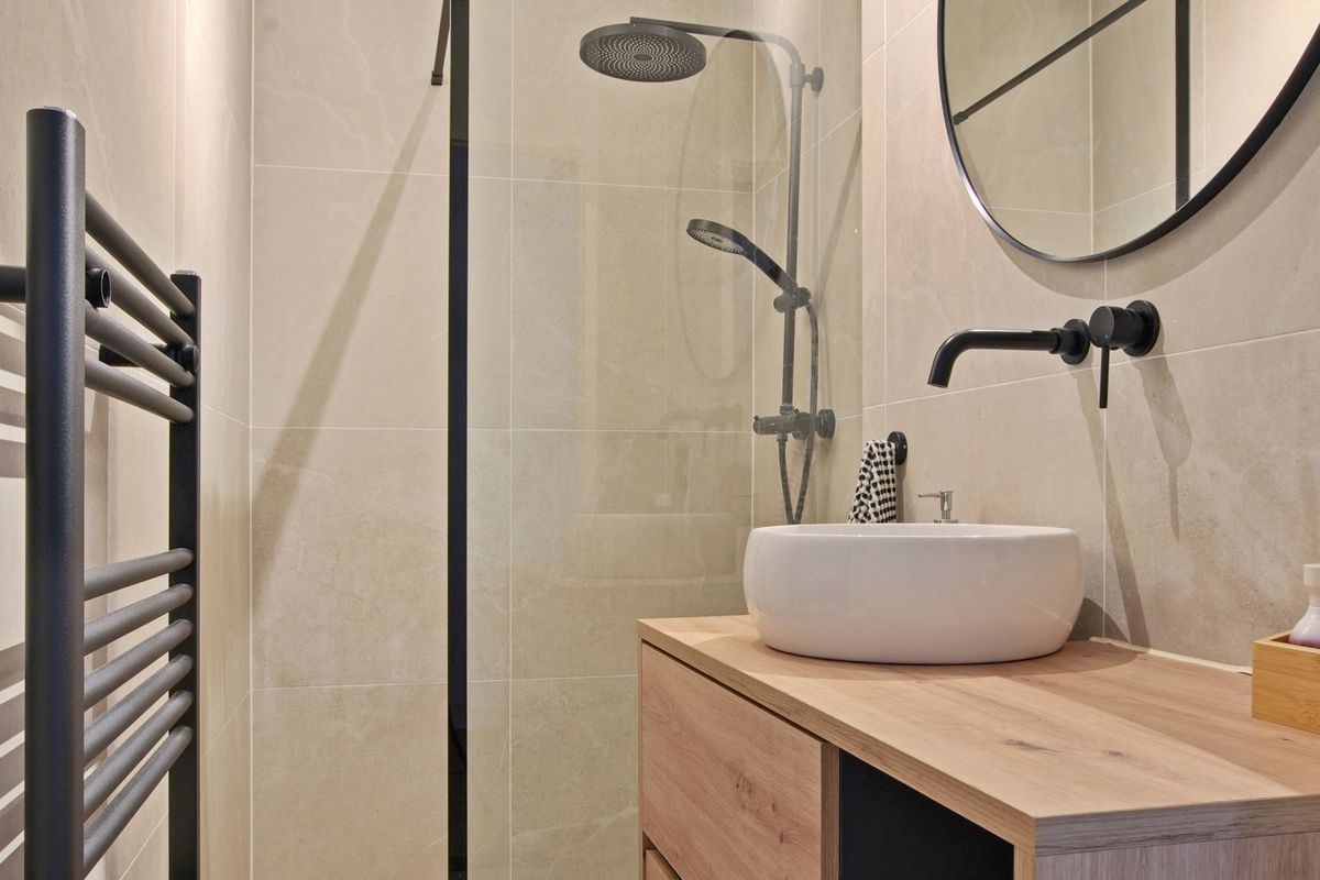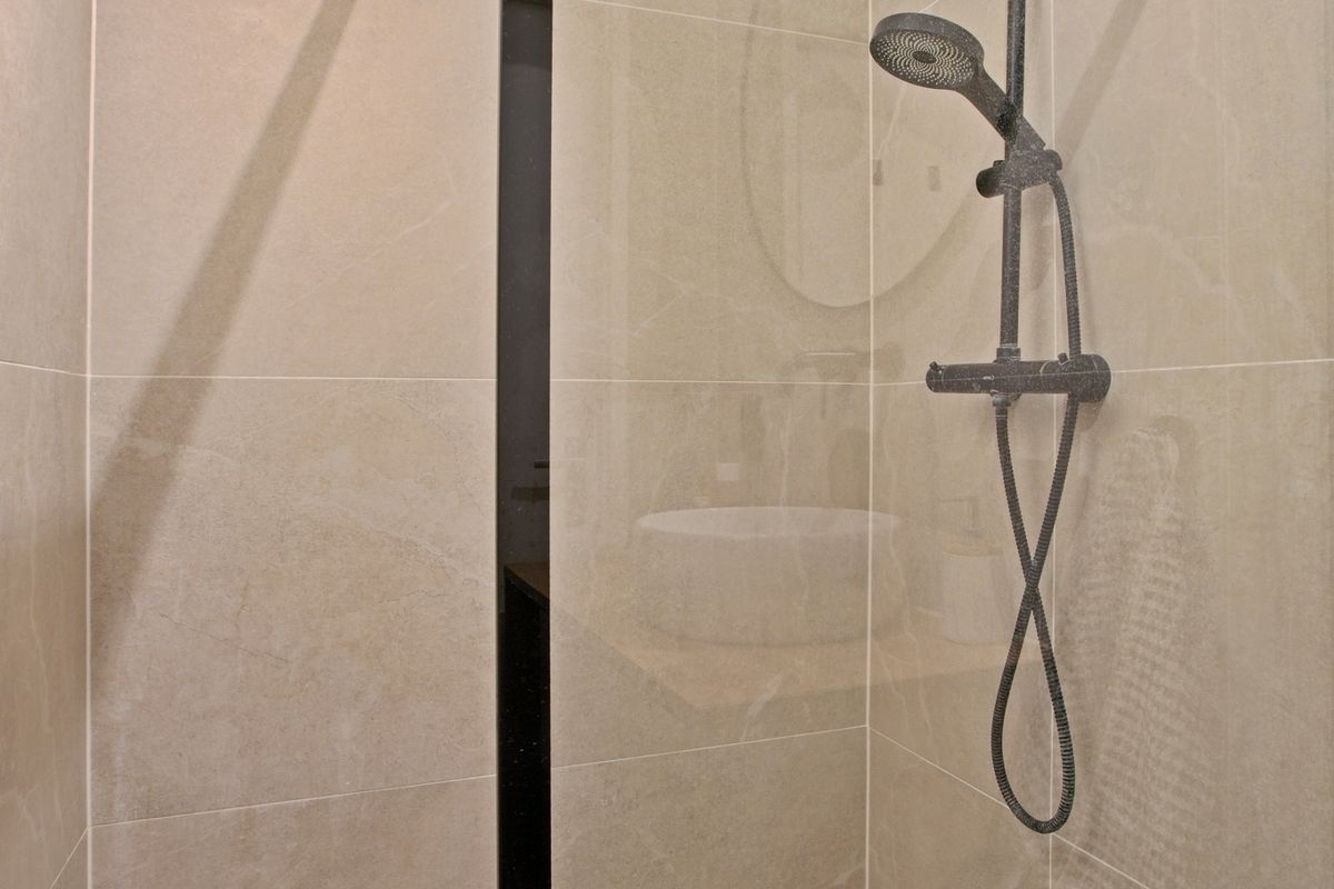 De ruime slaapkamer ligt aan de koele noordzijde van het appartement en biedt comfortabel plaats aan een tweepersoonsbed, kledingkast en eventueel een bureau – ideaal voor wie thuis werkt.