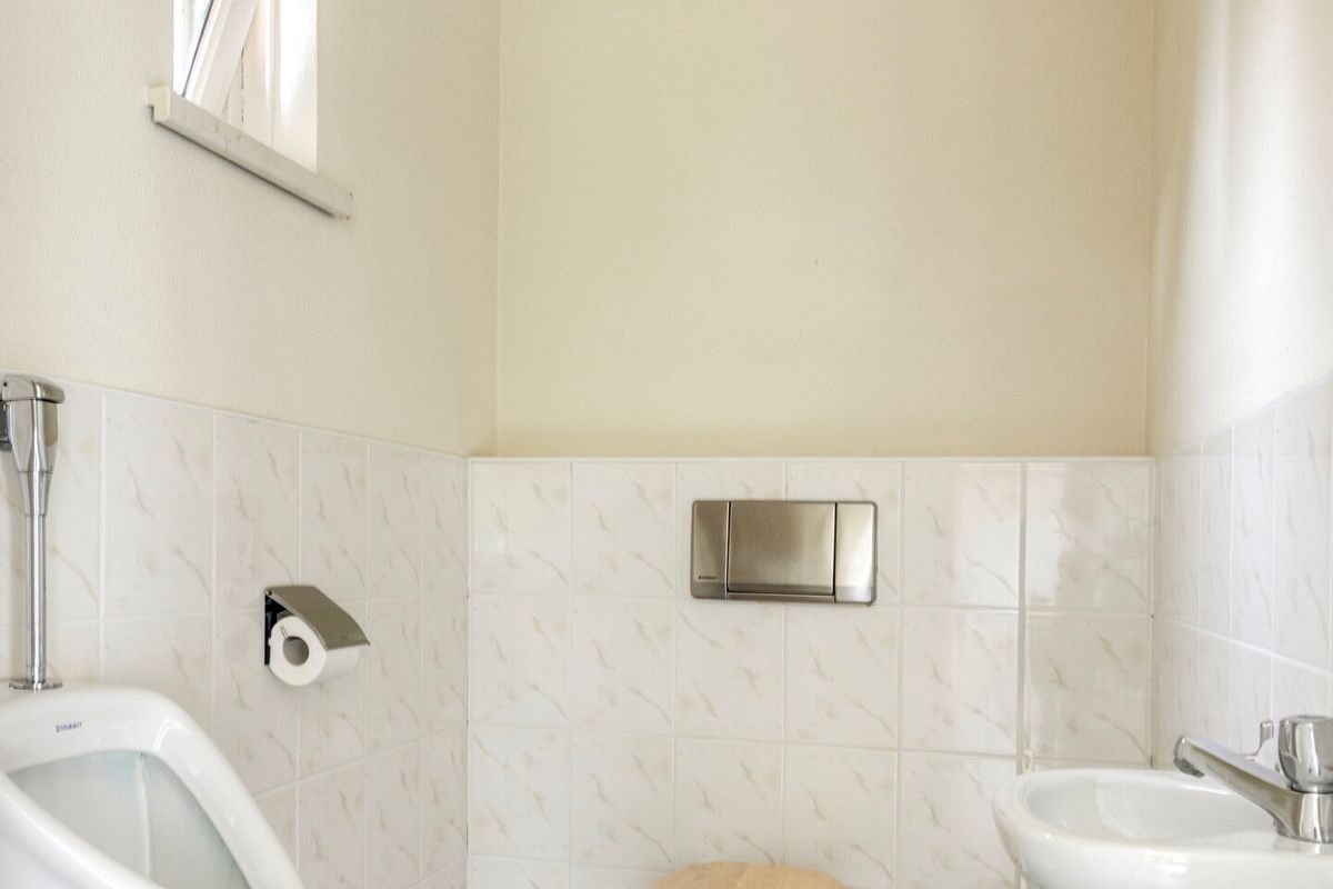 Overloop met 3 slaapkamers en de tweede badkamer voorzien van een toilet, wastafel en een douchehoek.