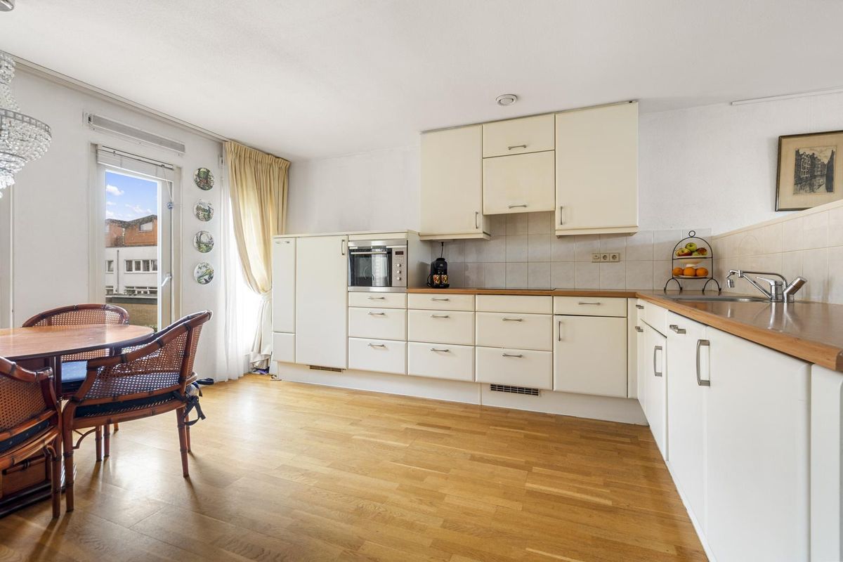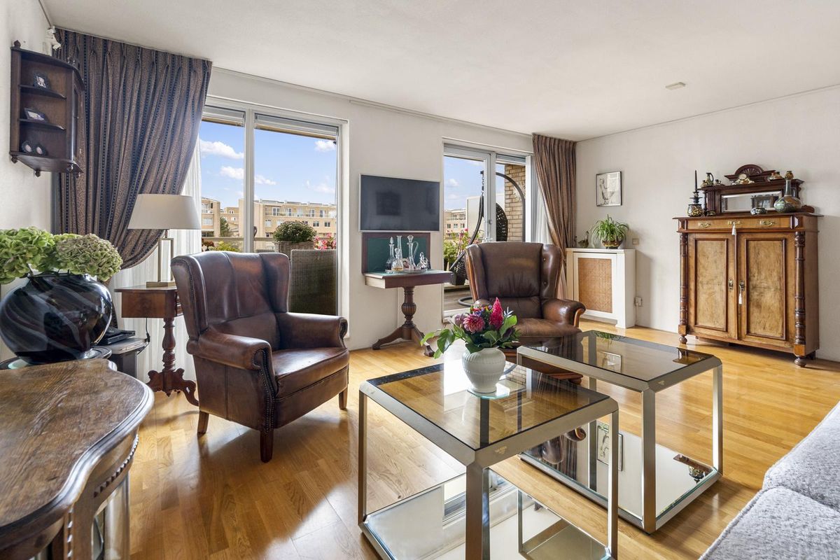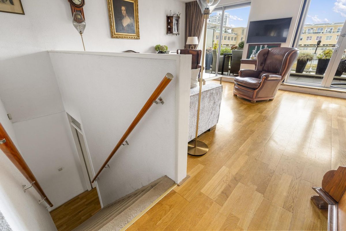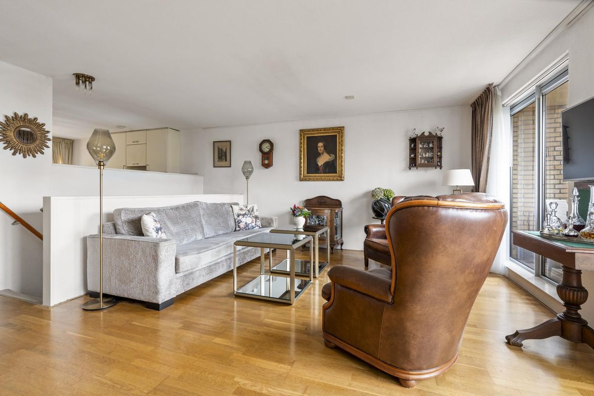 Hier bevindt zich de lichte en gezellige woonkamer met grote raampartijen en toegang tot het heerlijke balkon op het westen, met uitzicht op de groene binnentuin met vijver. Dankzij de gunstige ligging geniet je hier van de middag- en avondzon, terwijl het elektrische zonnescherm zorgt voor verkoeling op warme dagen.