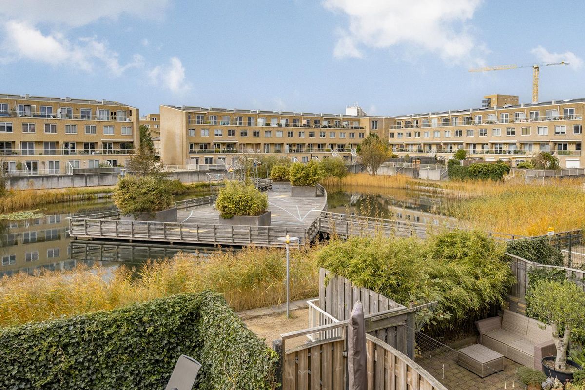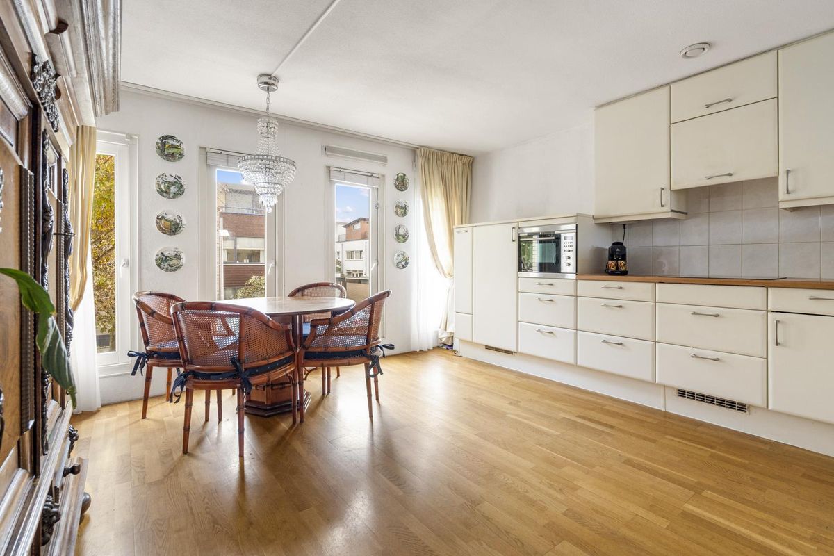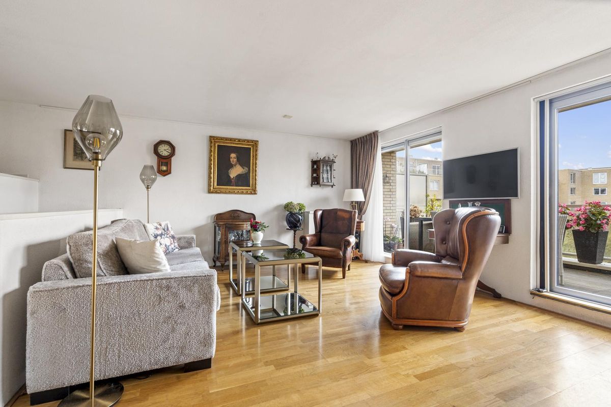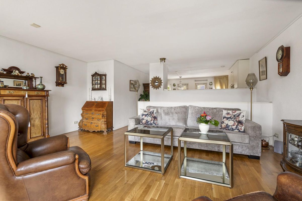 Hier bevindt zich de lichte en gezellige woonkamer met grote raampartijen en toegang tot het heerlijke balkon op het westen, met uitzicht op de groene binnentuin met vijver. Dankzij de gunstige ligging geniet je hier van de middag- en avondzon, terwijl het elektrische zonnescherm zorgt voor verkoeling op warme dagen.