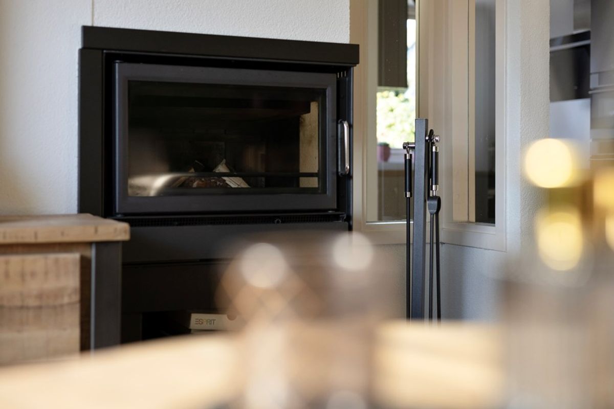 Woonkamer met sfeervolle open haard en open keuken welke luxe is uitgevoerd met diverse apparatuur.