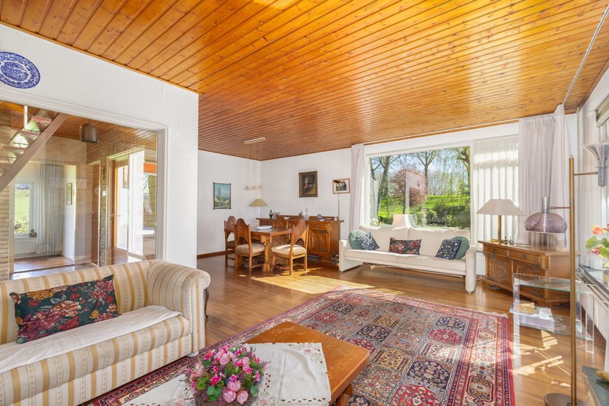 Bij binnenkomst maakt de woning direct indruk. De hal is voorzien van authentieke flagstones: Robuuste natuurstenen in warme tinten, stijlvol gelegd en kenmerkend voor de chique interieurs uit de jaren zestig. In combinatie met het houten plafond, de rijke lambrisering en de elegante open trap ontstaat een entree die zowel karaktervol als tijdloos is.