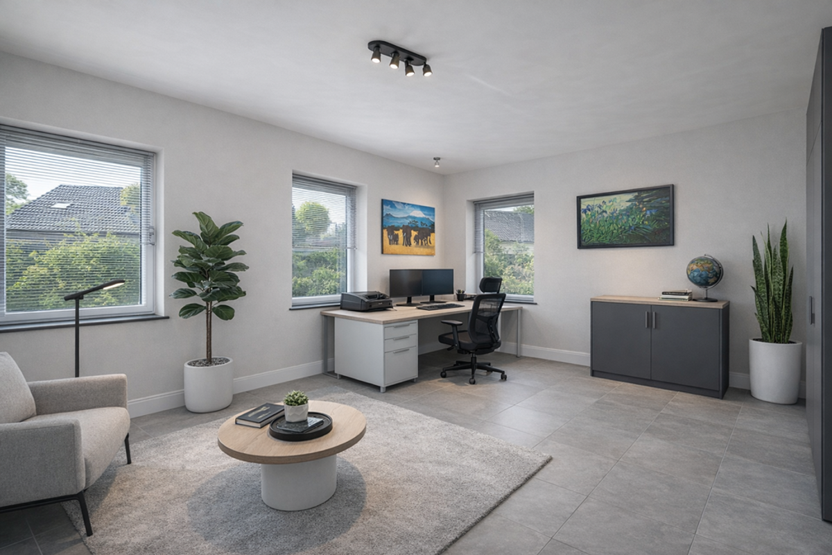 De woonkamer is licht en rustig, voorzien van een lichtstraat en open haard. De leefkeuken beschikt over een Boretti gasfornuis, granieten werkblad en vloerverwarming. Op de begane grond bevinden zich meerdere multifunctionele ruimtes, geschikt voor werken aan huis of extra slaapvertrekken.