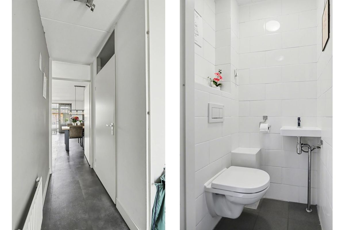 Bij binnenkomst betreed je de hal met meterkast, garderobe en toiletruimte. Het toilet is enkele jaren geleden volledig vernieuwd en uitgevoerd met een zwevend closet en fonteintje. Vanuit de hal is er toegang tot het woon-/keukengedeelte.