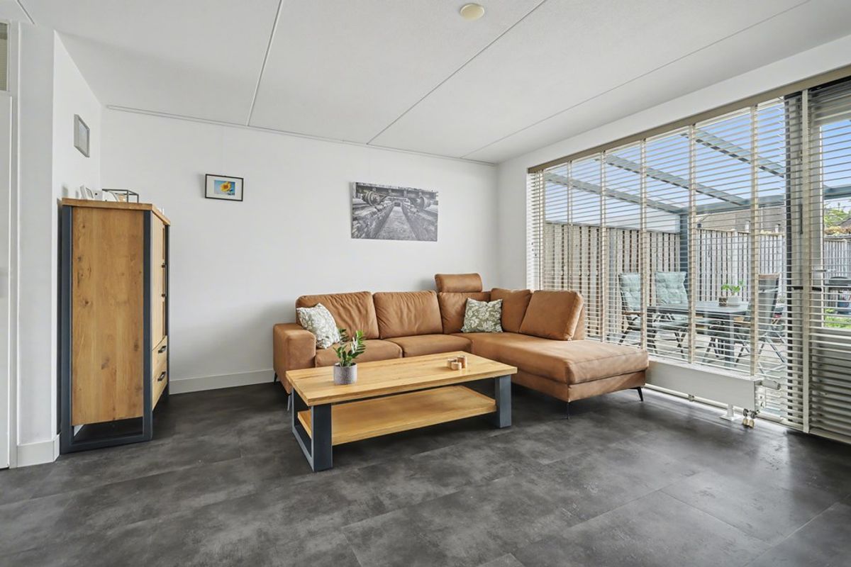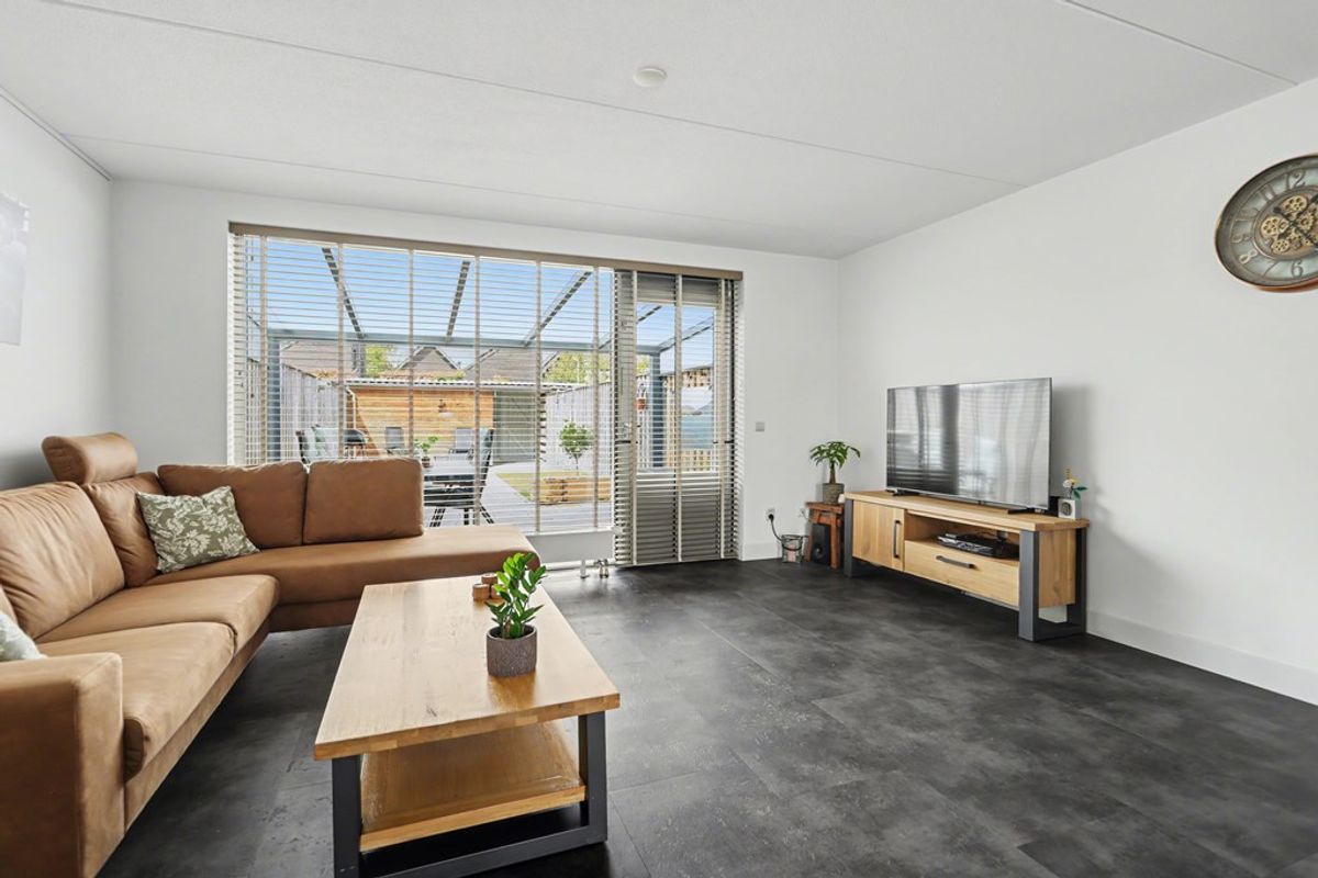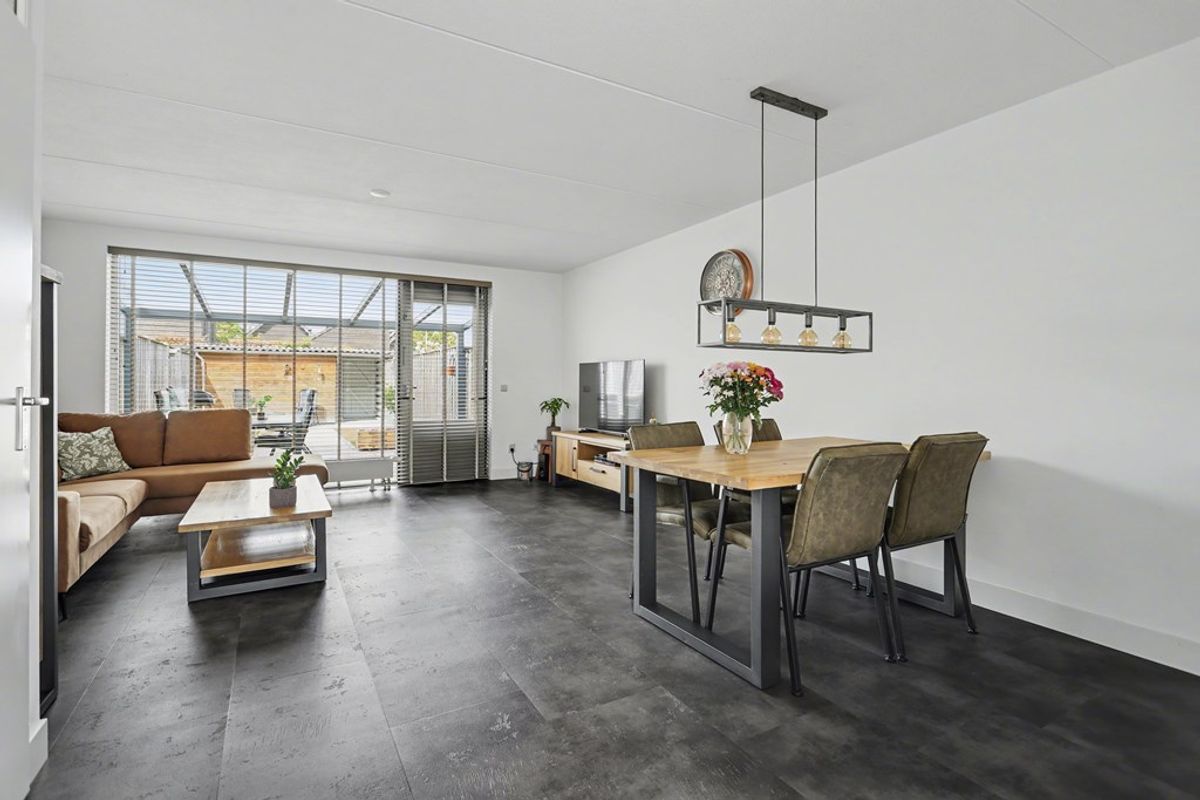De woonkamer valt direct op door de royale lichtinval, dankzij de grote raampartijen aan zowel de voor- als achterzijde. Dit zorgt voor een lichte en aangename sfeer. De moderne PVC-vloer vormt een strakke en neutrale basis die past bij iedere woonstijl.