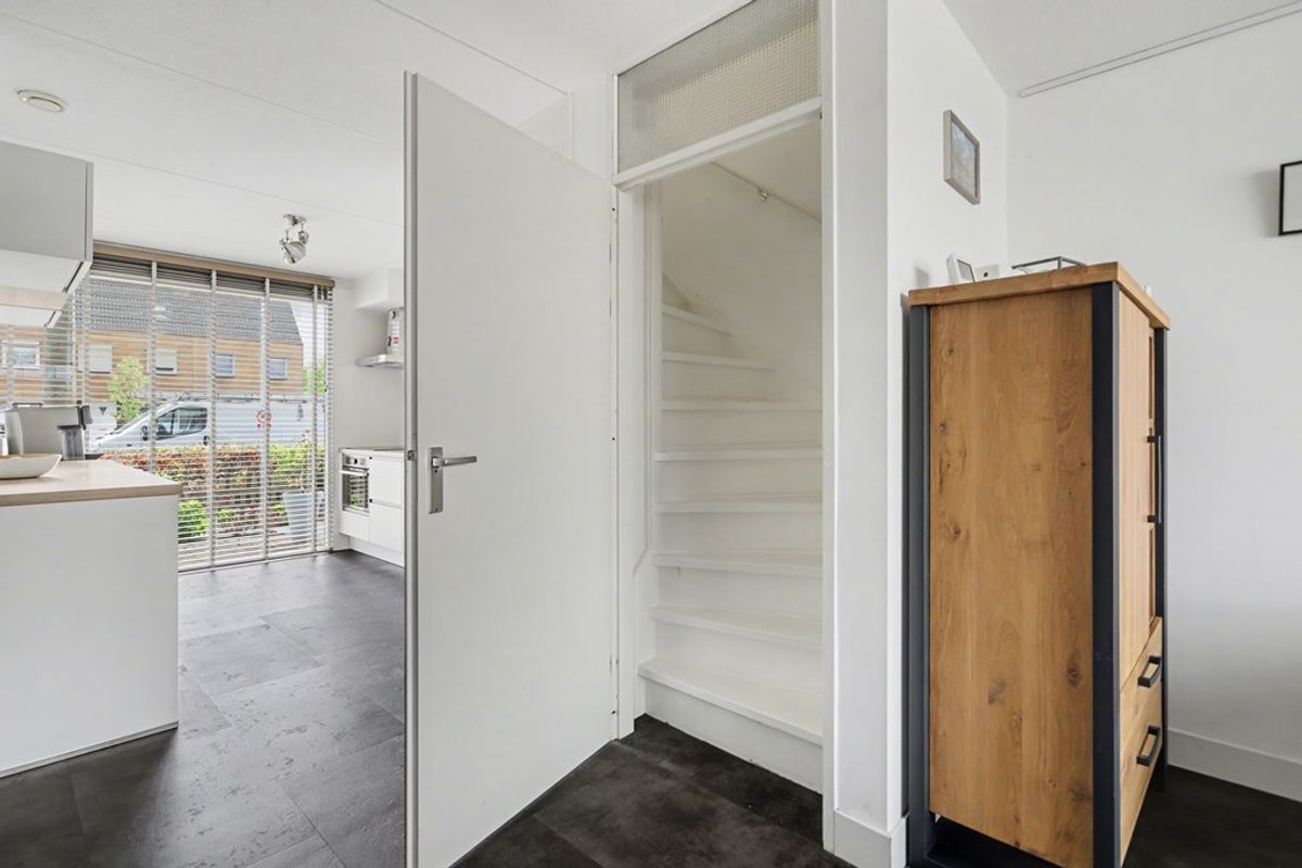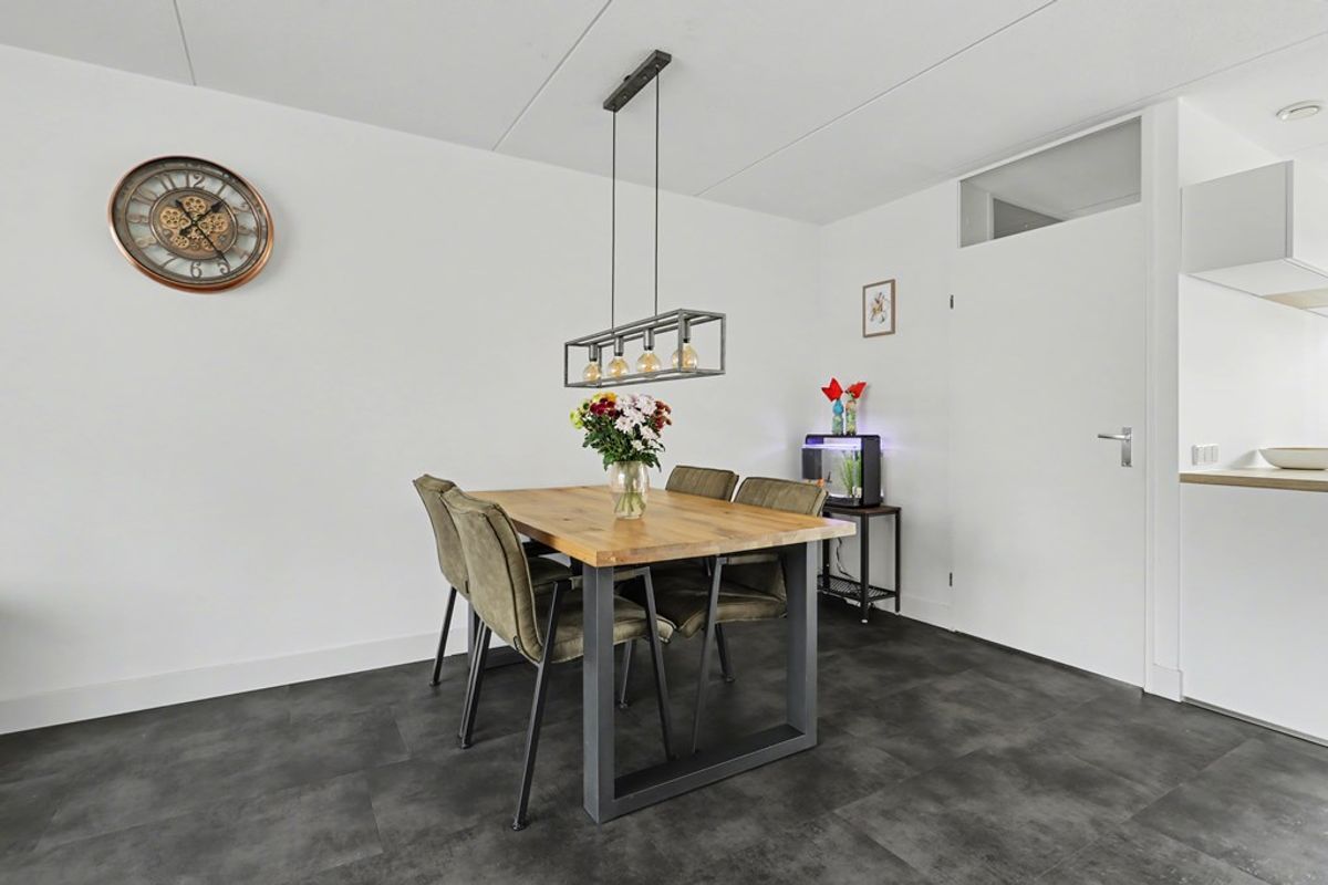 Aan de achterzijde ligt de tuingerichte woonkamer, ingedeeld met een ruime zithoek en een eethoek. De zithoek bevindt zich aan de tuinzijde en profiteert van veel natuurlijk daglicht door de grote raampartij. Vanuit de woonkamer is tevens toegang tot de trapopgang en een praktische trapkast, ideaal voor extra bergruimte.