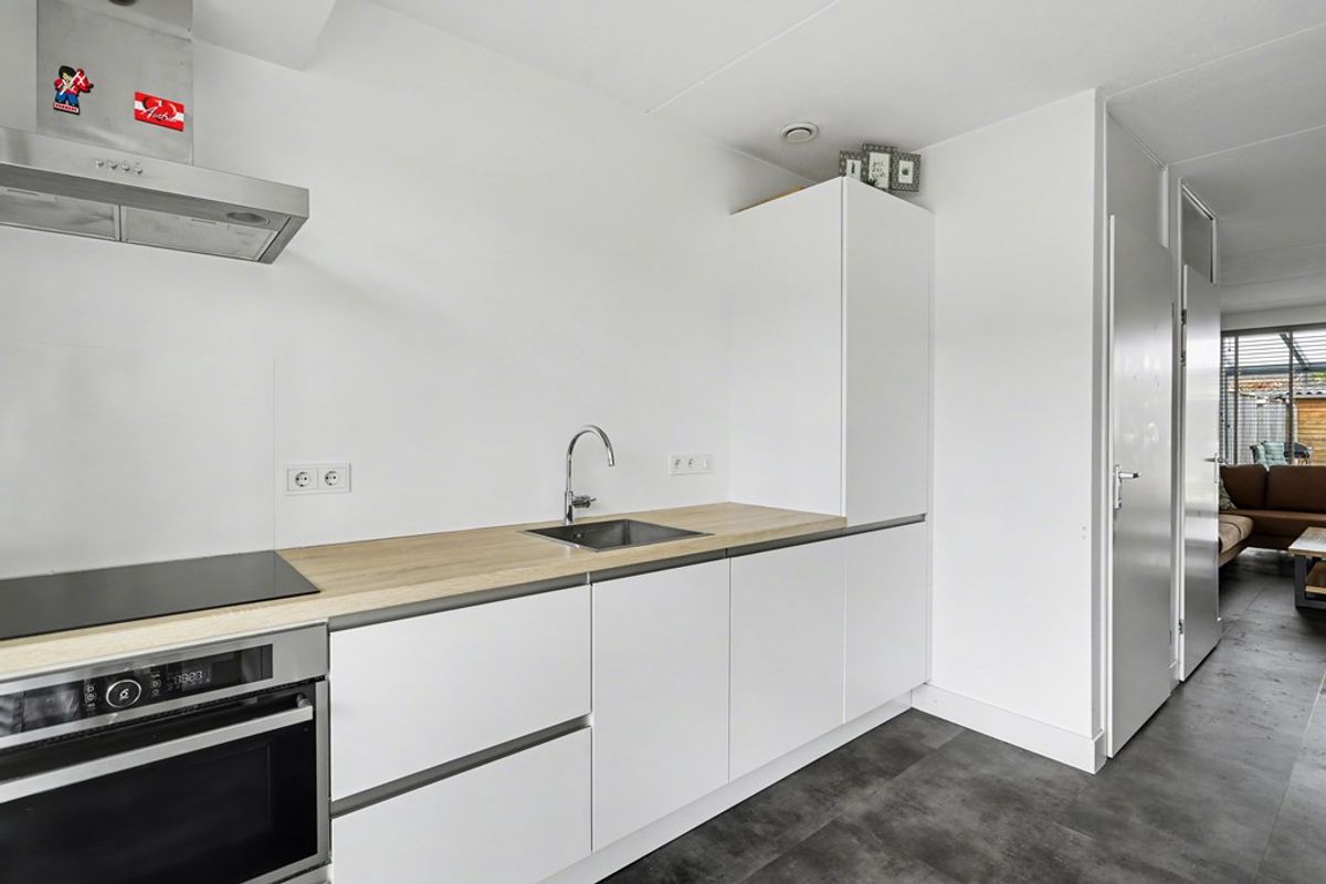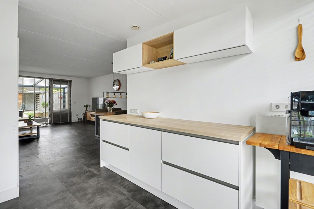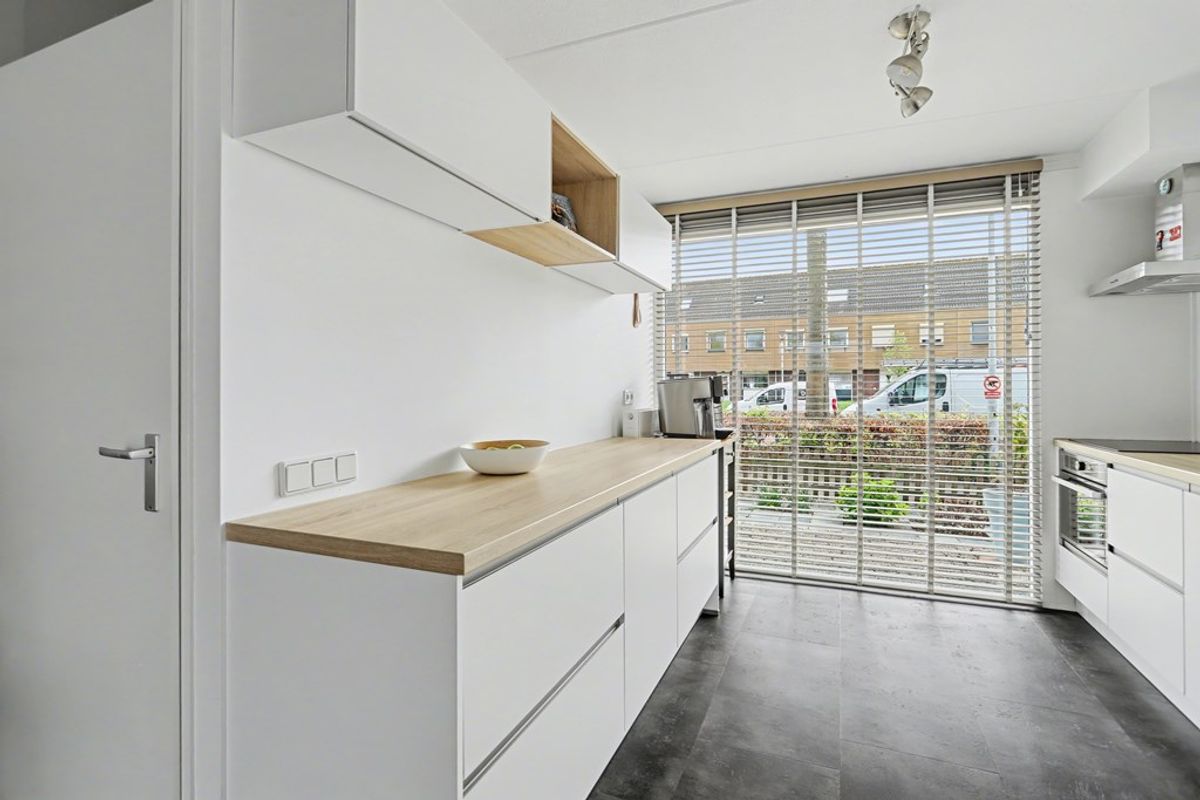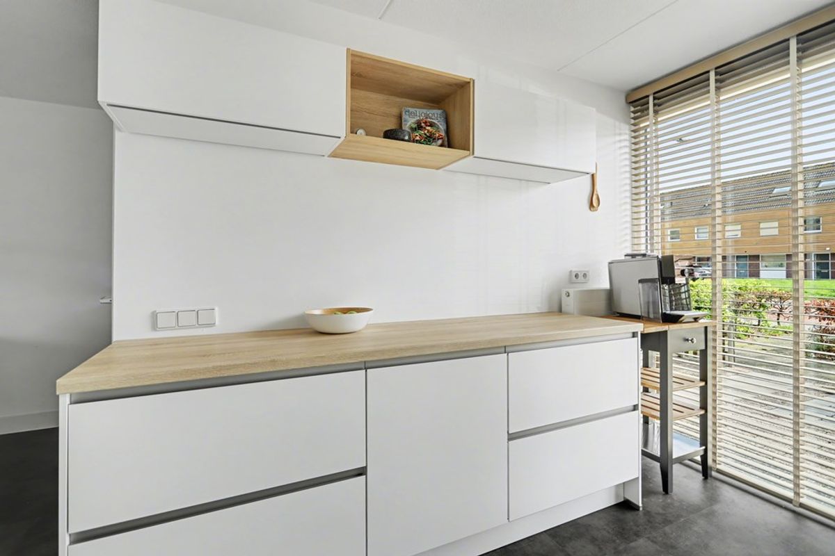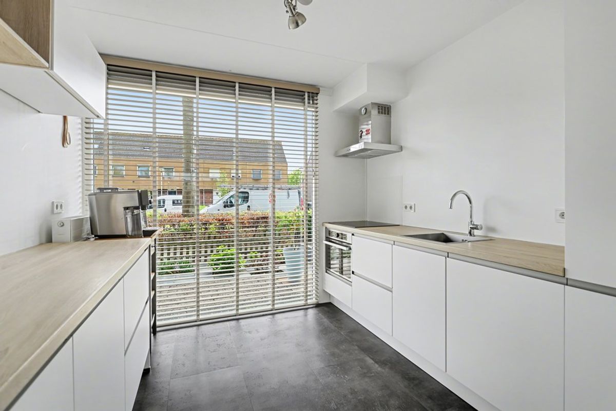 Aan de voorzijde van de woning bevindt zich de open keuken, die naadloos overloopt in de woonkamer. Een gezellige plek waar koken en samenzijn samenkomen. De keuken is modern uitgevoerd, voorzien van werkbladen aan beide zijden en beschikt over diverse inbouwapparatuur, waardoor er volop werkruimte is voor de thuiskok.