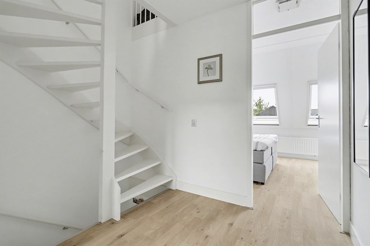Via een vaste trap bereik je de tweede verdieping. Deze open ruimte beschikt over een groot dakraam aan de voorzijde, wat zorgt voor een prettige lichtinval.