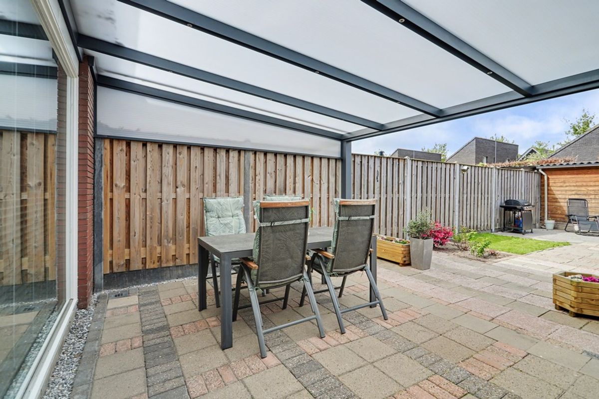 Een echte eyecatcher is de luxe overkapping met ingebouwde spots, waar je heerlijk kunt ontspannen tijdens lange zomeravonden. Dankzij de diepte van de tuin is er altijd wel een fijne plek te vinden in de zon of juist in de schaduw.