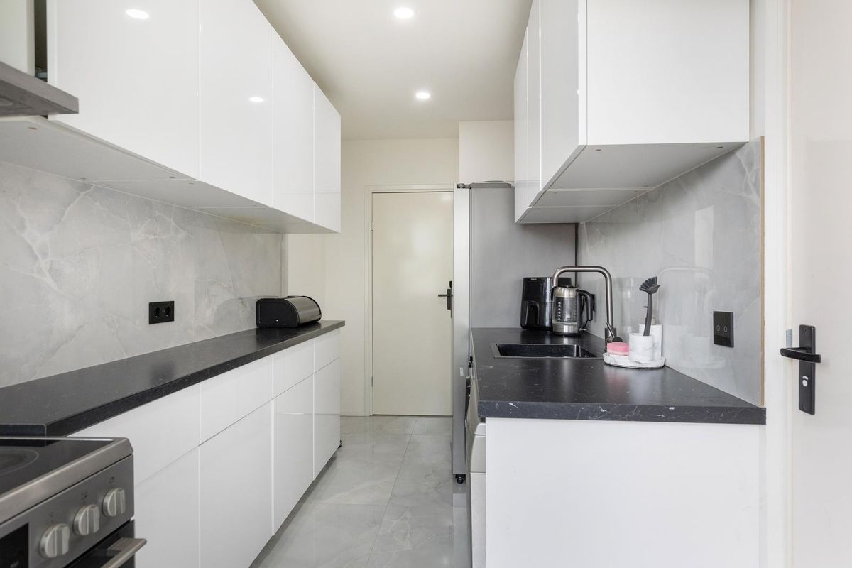 De keuken is strak vormgegeven met hoogglans kasten, een donker werkblad en veel opbergruimte. De keuken is voorzien van een 4 pits inductiekookplaat, vaatwasser, oven en losse koel-vriescombi. Vanuit de keuken stap je zo het balkon op. Deze ligt op het noordoosten, dus je geniet hier in de ochtend van de zon. De vaste kast op het balkon is ideaal voor tuinspullen of andere opbergwensen.