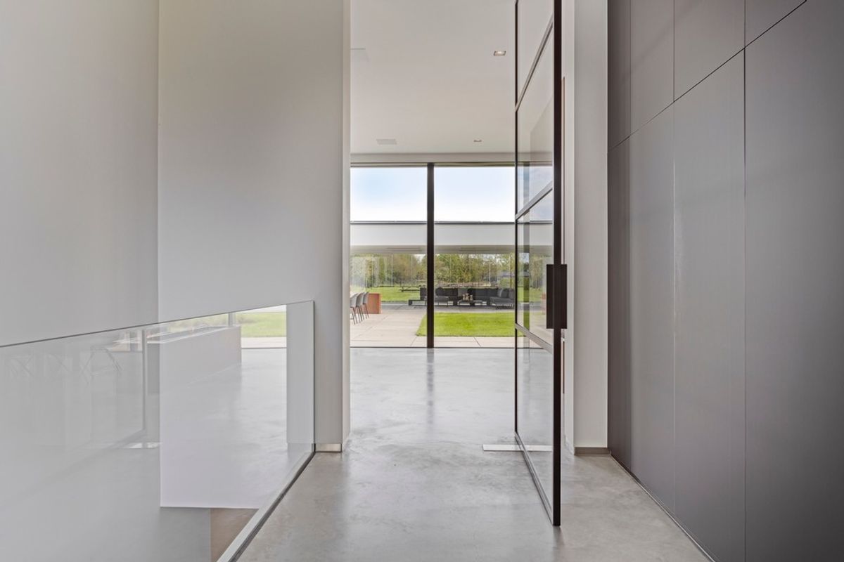 Eenmaal bij de woning aangekomen parkeert u uw auto op eigen terrein. Middels een brede voordeur, welke dankzij de domotica zorgt voor een adembenemende entree, komt u via een prachtige royale centrale hal de woning binnen. Aan de rechterzijde wordt u begroet door stijlvolle op maat gemaakte Fenix-inbouwkasten die een voorproefje geven van het verfijnde interieurdesign dat door de hele woning schittert.