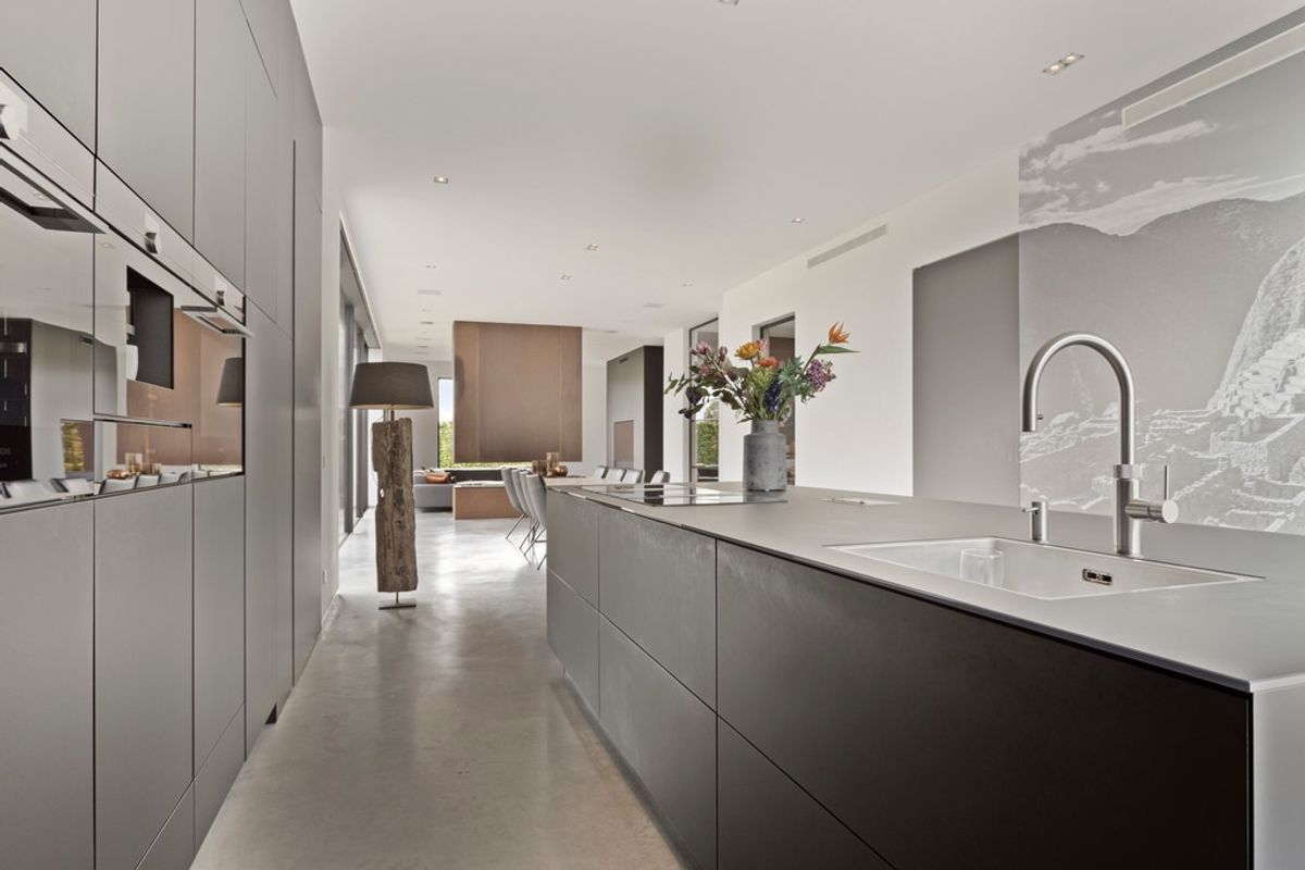 Ook in de royale keuken ziet u de stijlvolle Fenix afwerking terugkomen in de touch-keukenkasten en een akoestisch plafond. De keuken beschikt over een keukeneiland van maar liefst 3.30 meter breed, welke is afgewerkt met een glazen werkblad (met gehard glas). De keuken is uitgerust met een uitgebreid assortiment aan keukenapparatuur, te beginnen met een 6-pits Bora inductiekookplaat met 2(!) afzuigsystemen, voedselversnipperaar, Quooker, warmtelade, twee koelkasten, diepvries en een stopcontact eiland. Deze keuken biedt een overvloed aan voorzieningen en verdient het om bewonderd te worden!