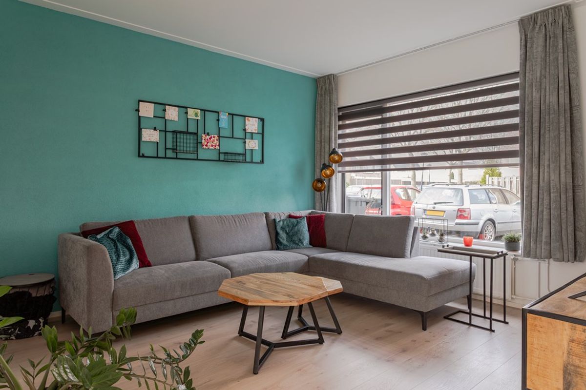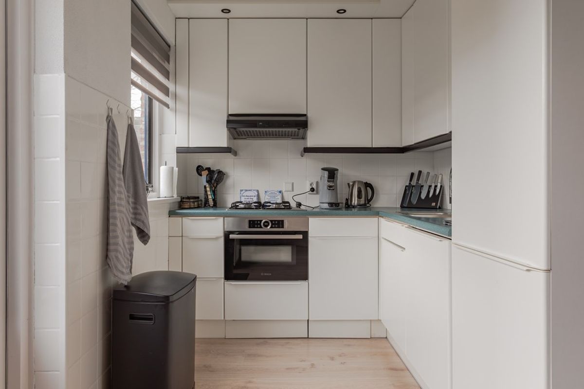 De zithoek is straatgericht en je kan leuk wegkijken op een Gemeenteplantsoentje. Er is veel lichtinval vanwege de grote raampartij en het zijraam kan open wat altijd prettig is om goed te kunnen ventileren. De lichte laminaatvloer is vanuit de hal doorgelegd in de living, er zijn gespoten wanden en een strak gestuukt plafond met een platte plint. In de praktische en diepe trapkast met verlichting en stopcontact achter een “stoere” schuifdeur met rail is volop bergruimte voor stofzuiger, schoonmaakspullen en voorraad.
