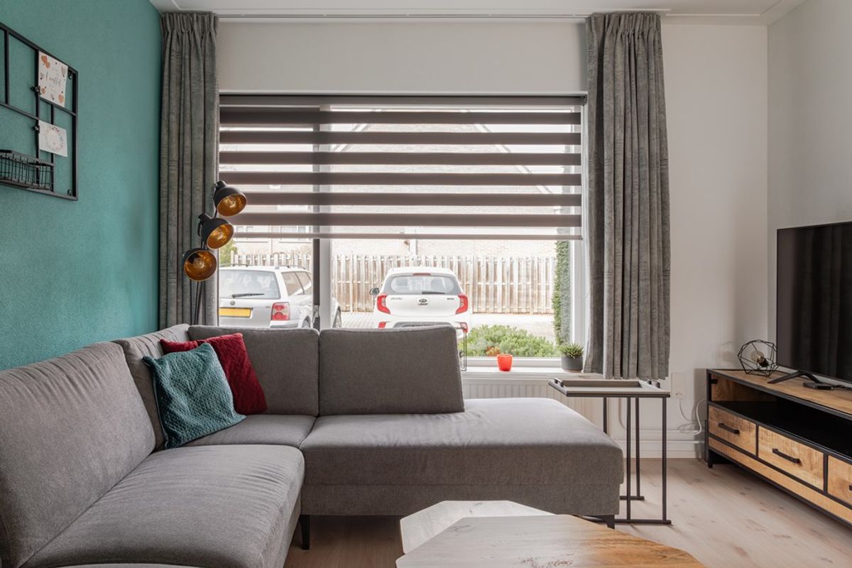 Parkeren kan in het hofje voor de woning en achter de voordeur is de hal met een garderobehoek, radiator, gespoten wanden en een lichte laminaatvloer.