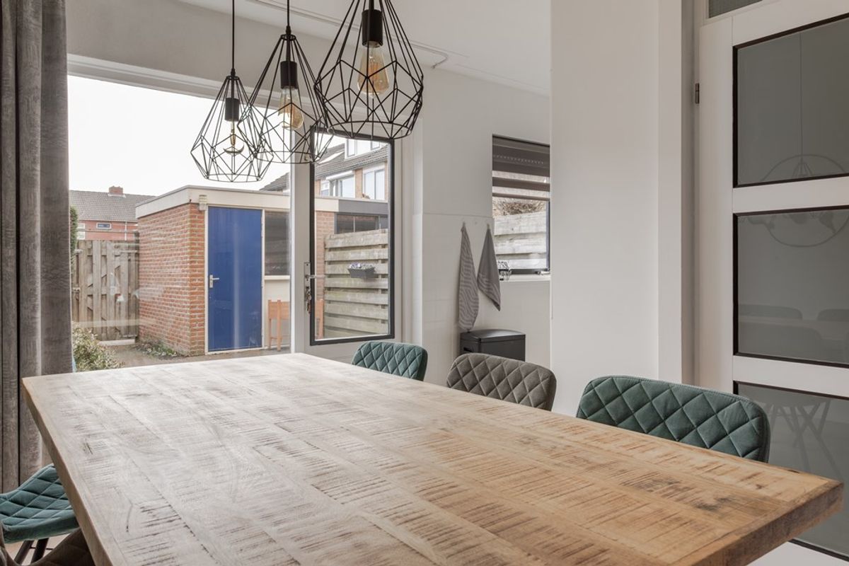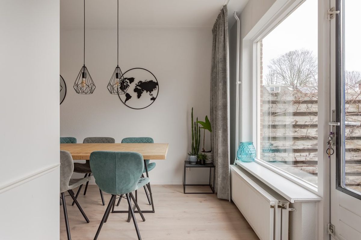 De eethoek naast de keuken heeft zicht op de zonnig gelegen tuin met ook weer een groot raam en de tuindeur.