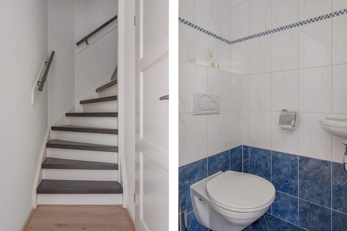 Een moderne paneeldeur met melkglas geeft toegang tot de tussenhal met de trapopgang en het toilet met geheel betegelde wanden, een wandcloset, hoekfonteintje en centraal afzuigsysteem.