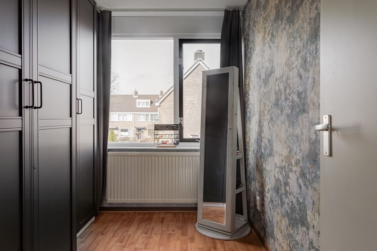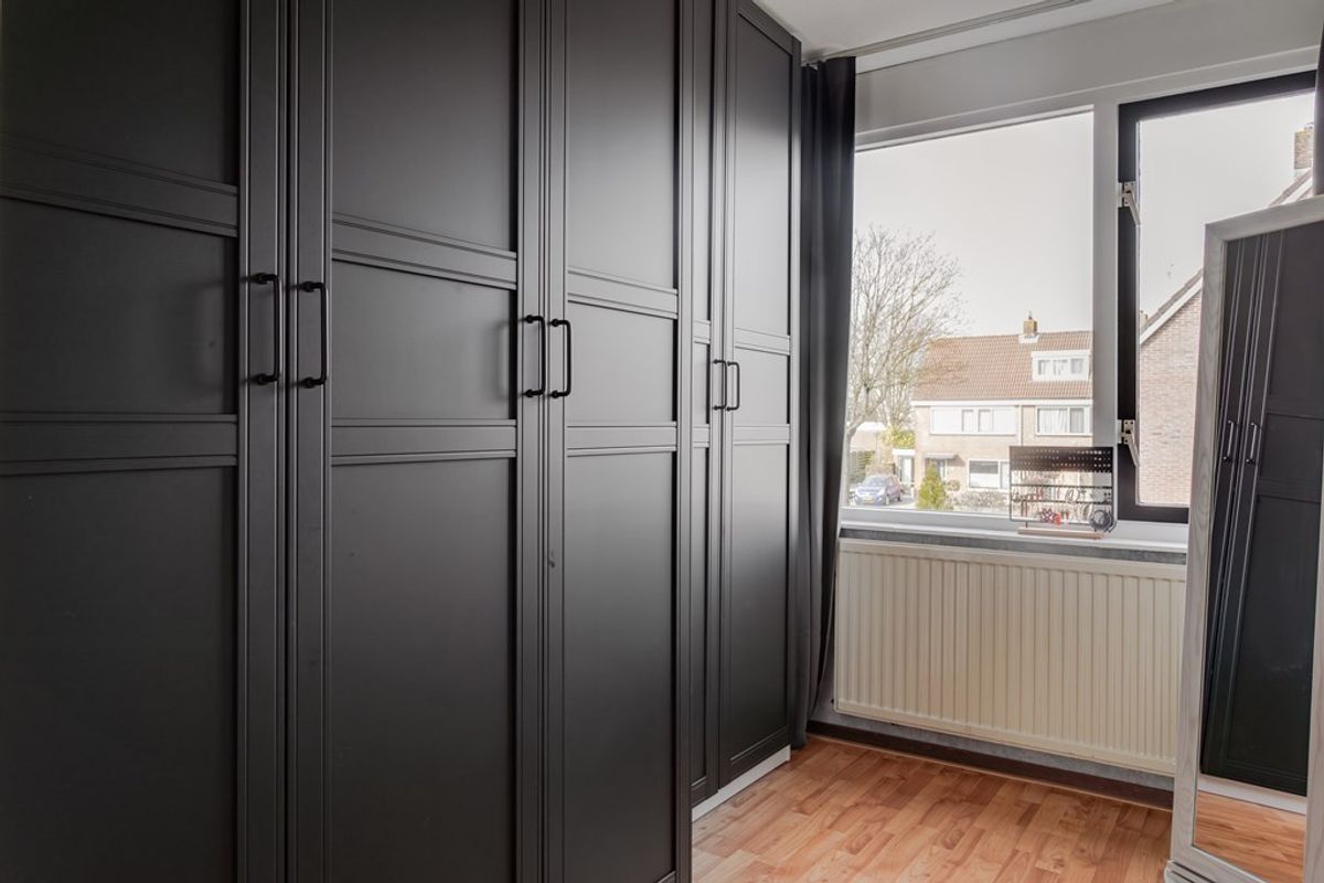 2e Slaapkamer voorzijde – royale kamer met recht opgetrokken wanden, stijlvol behangen, laminaatvloer, groot raam met dubbel glas en het zijraam kan open. Fijn gegeven is dat je geen inkijk hebt van overburen en in 2021 is er een nieuwe radiator geplaatst.