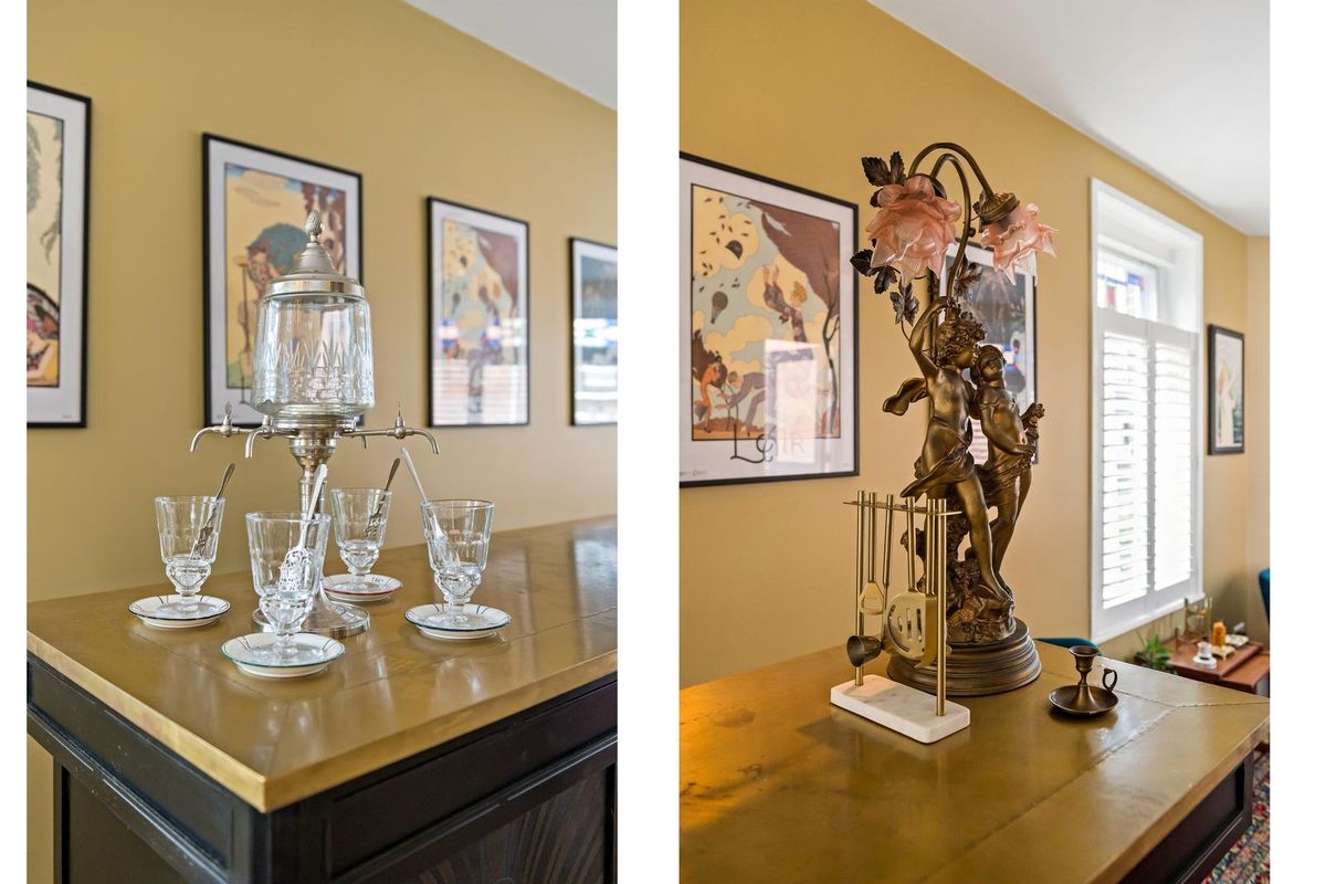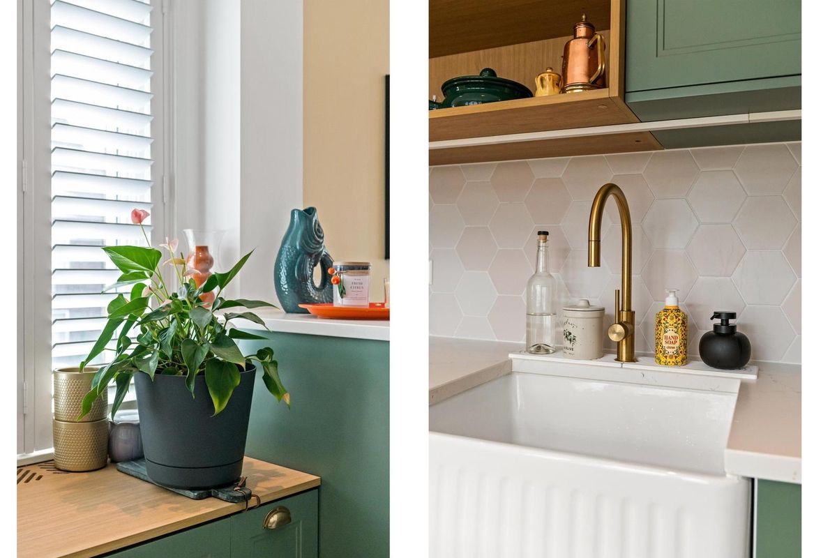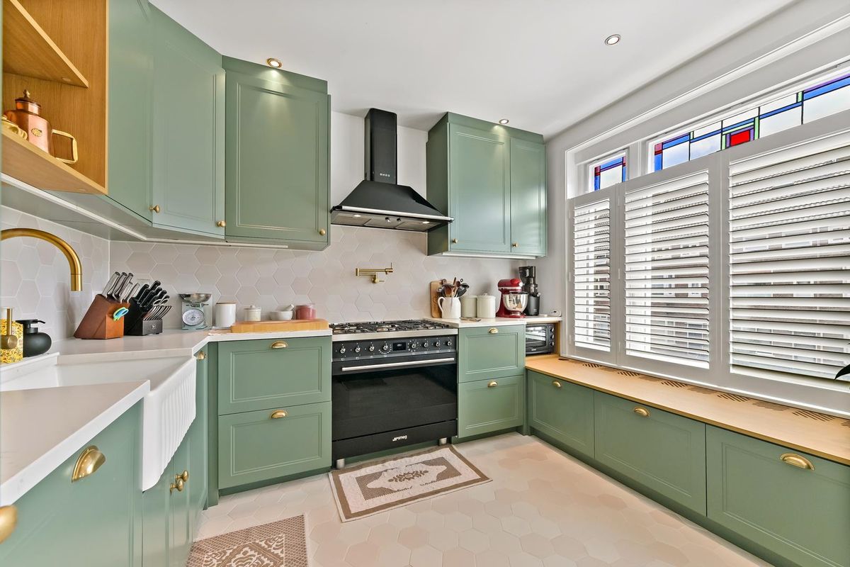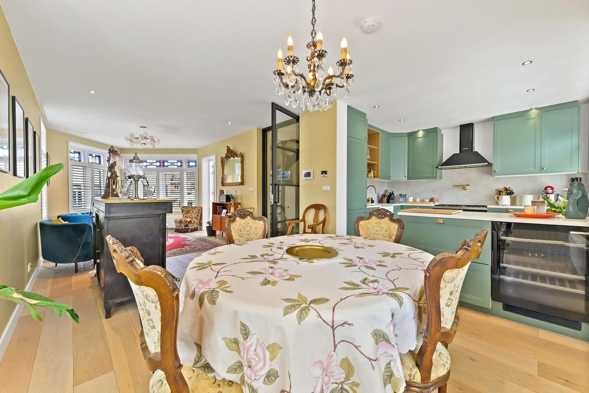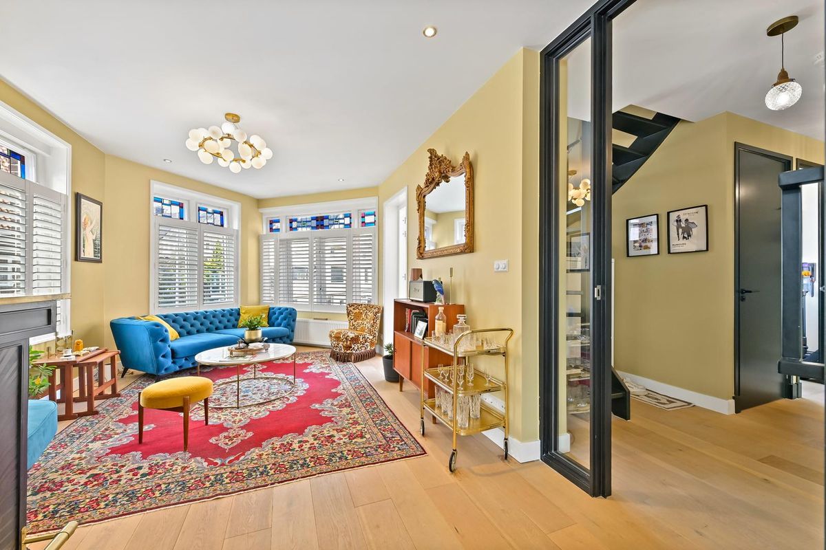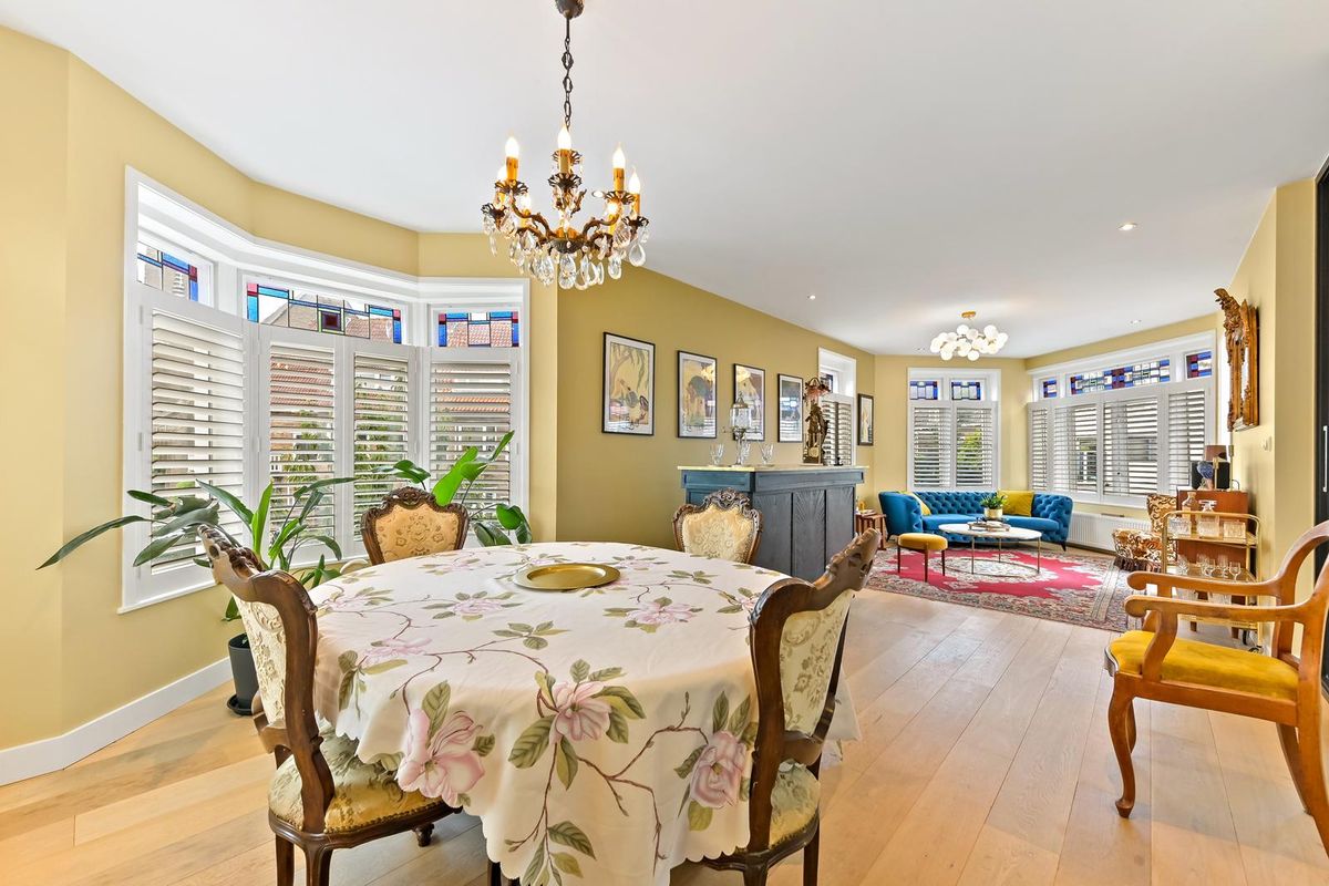 Ruime overloop met toilet voorzien van vrij hangend closet en fonteintje, wasruimte, werkkamer, stalen deur naar woonkamer. De lichte woonkamer heeft maar liefst 3 zichtzijdes en heeft mooie authentieke elementen zoals het glas in lood en de erker. De luxe open keuken van ruim 10 m² is in 2024 geplaatst en heeft nog garantie. Ruim terras met middag en avondzon.