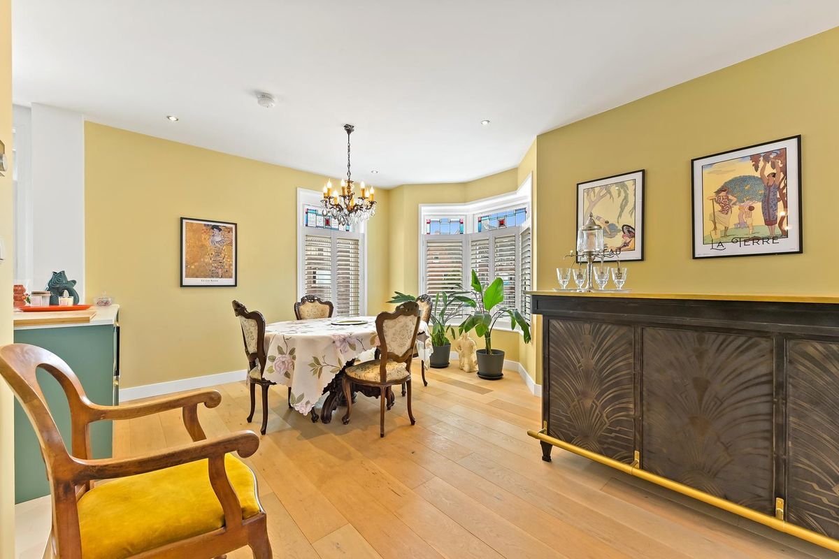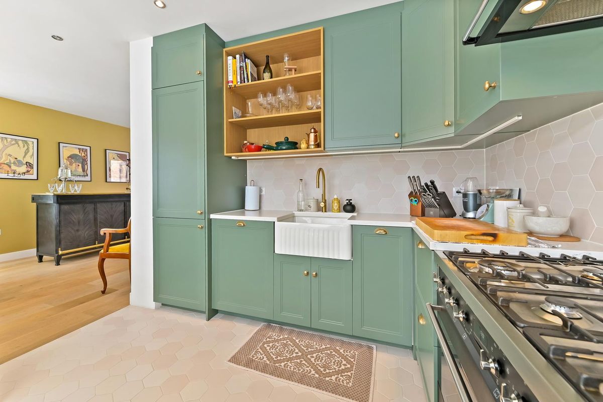 Spacious landing with toilet (wall-mounted with hand basin), laundry room, home office, and a steel door leading to the living room. The bright and airy living room benefits from three aspects, featuring authentic details such as stained glass windows and a bay window. The luxurious open kitchen (over 10 m²), installed in 2024, still has a valid warranty. From the living room, there is access to a generously sized terrace with afternoon and evening sun.