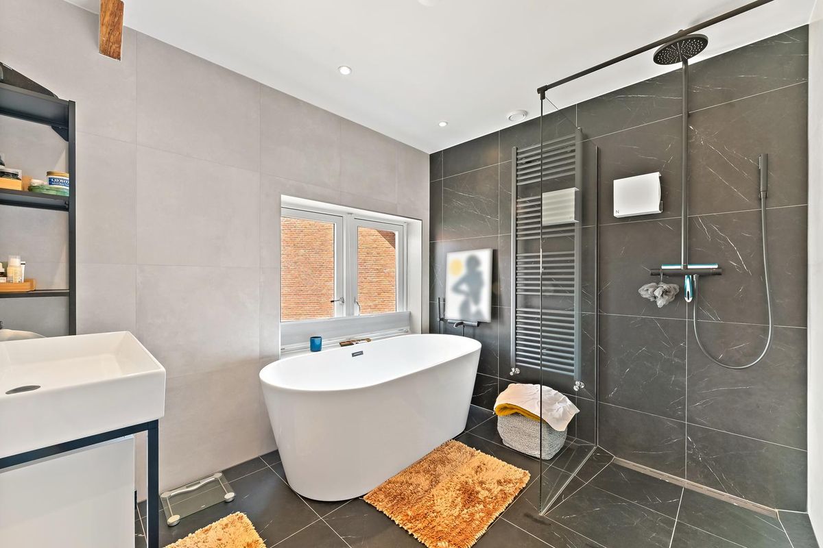 Overloop, 3 ruime slaapkamers van maar liefst, 10, 13 en 14 m², ruim opgezette badkamer met vrijstaand bad, inloopdouche en wastafelmeubel.