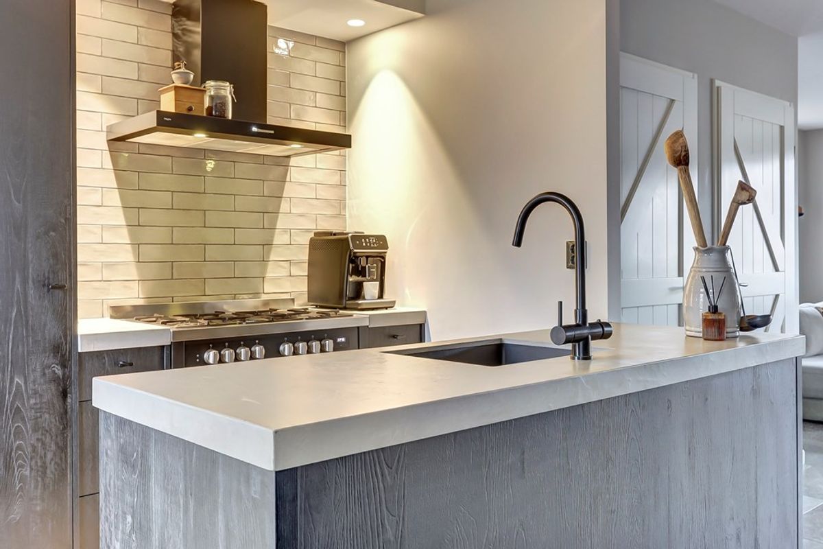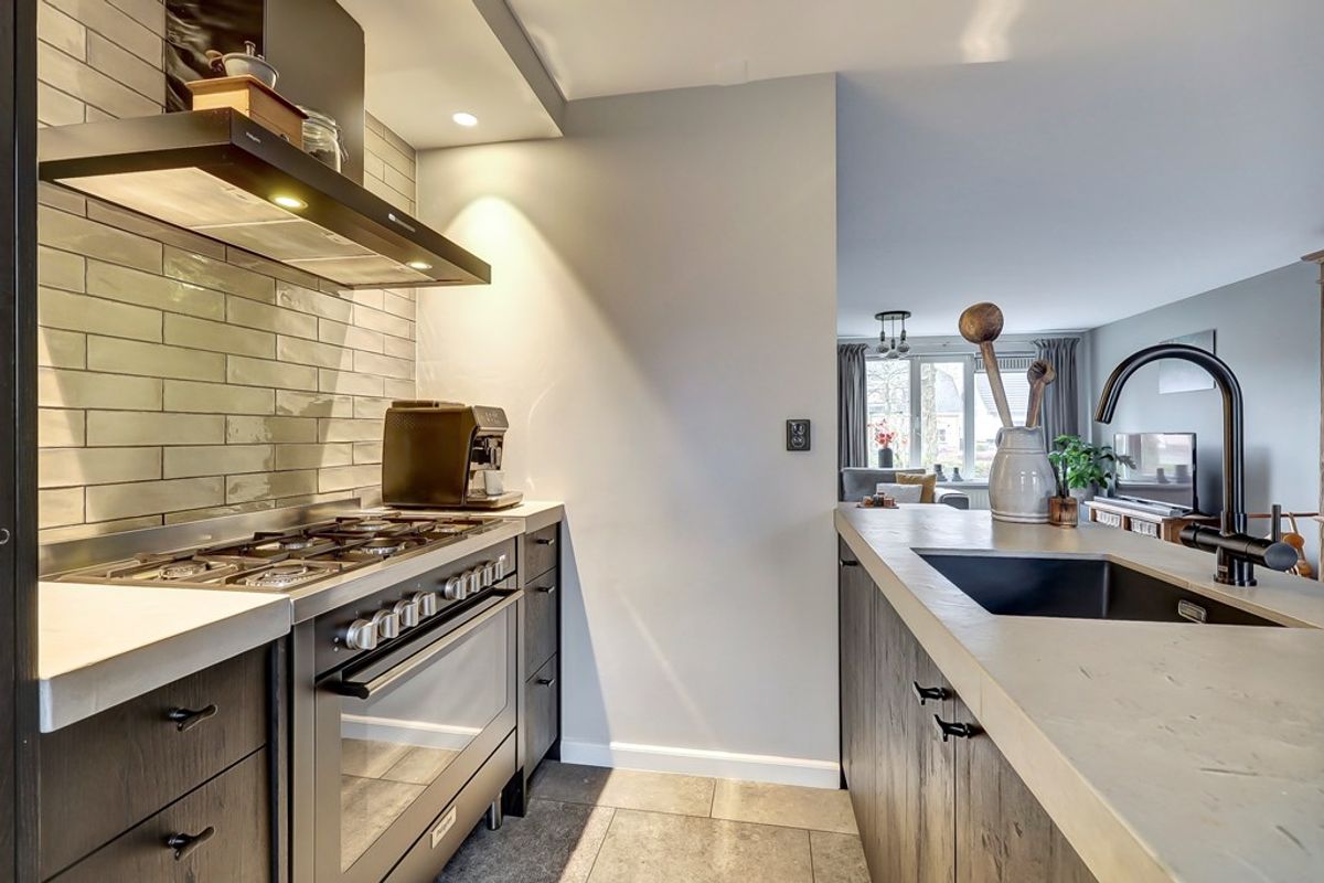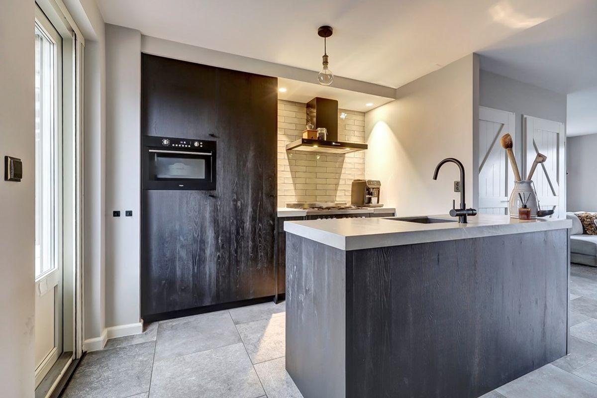 Vanuit de woonkamer loop je zo de open keuken uit 2021 in. De keuken staat in een rechte opstelling tegen de wand en daar tegenover is een spoeleiland.