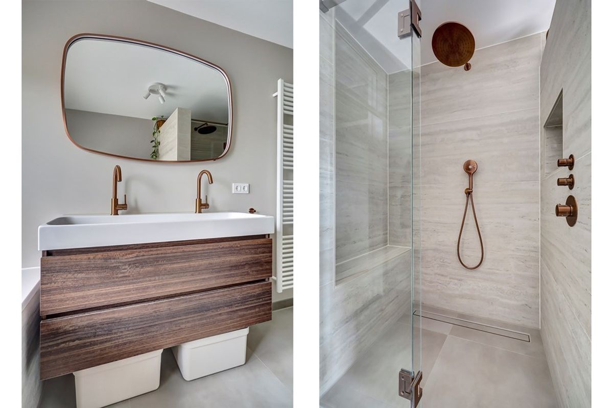 De badkamer van ca 7m2 is aan de voorzijde gelegen en was oorspronkelijk de 3e slaapkamer op deze verdieping. De badkamer is voorzien van een tegelvloer de wanden zijn gedeeltelijk betegeld en gedeeltelijk mooi strak gestukt en geverfd. De badkamer is voorzien van een ruime inloopdouche met stortdouche en handdouche, een hangend closet, ligbad met handdouche, een brede dubbele wastafel met meubel er onder en een grote spiegel met verlichting erboven. Alle kranen van de douche en het bad zijn netjes in de muur verwerkt. De badkamer heeft ook een elektrische radiator, een strak gestukt plafond en een kunststof kozijn met dubbel glas.