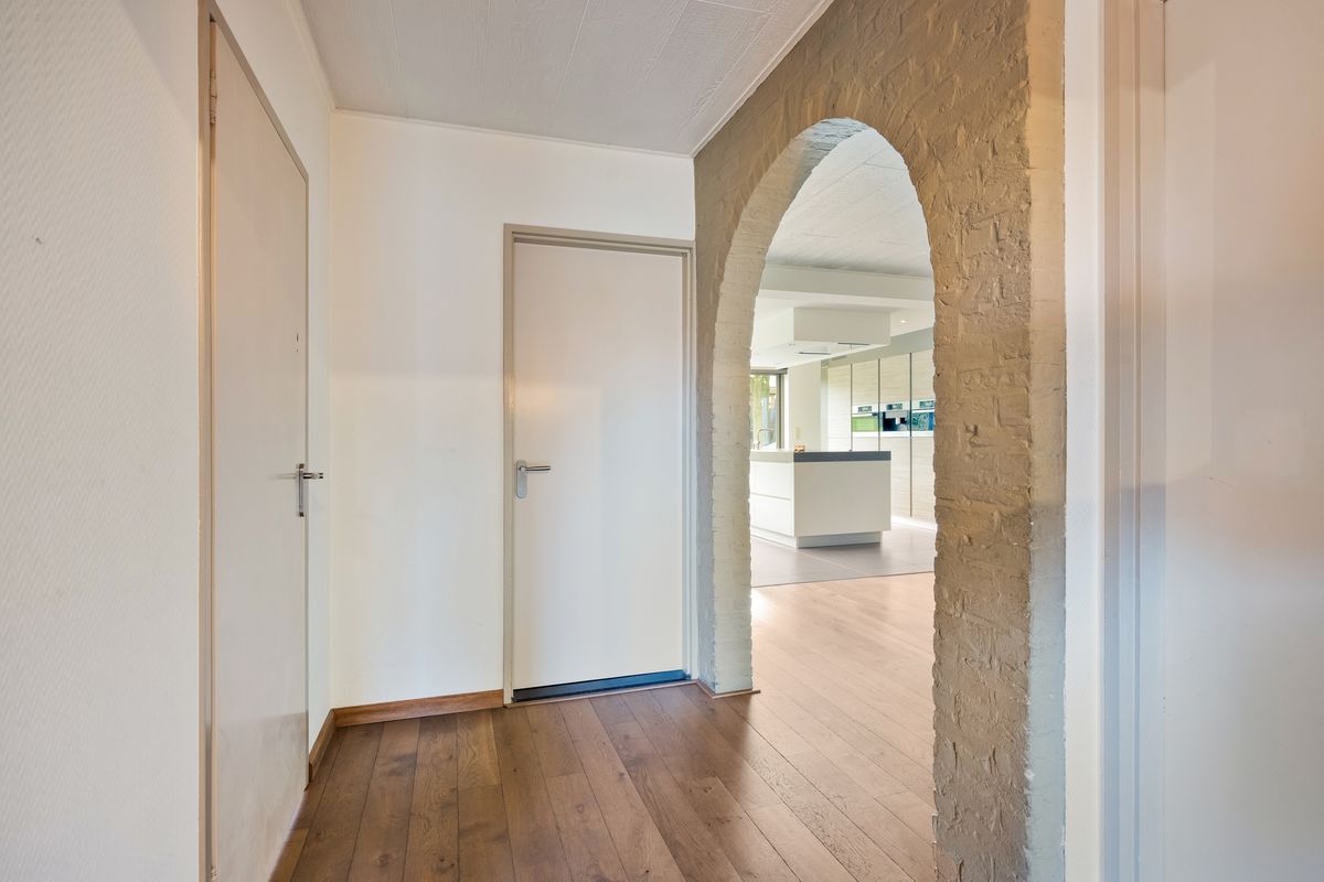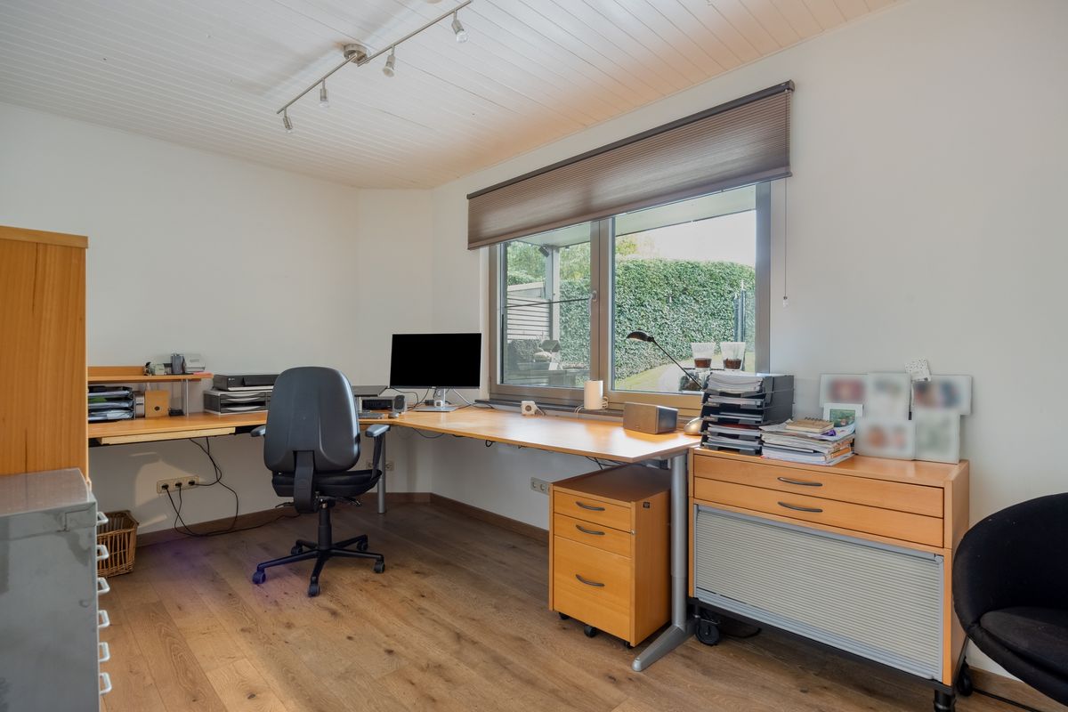 Begane grond (niveau achtertuin); entree, toilet met fonteintje, woonkamer met fijne houtkachel. De woonkamer staat in open verbinding met de moderne keuken in de lichte aanbouw. De keuken is van alle gemakken voorzien en beschikt over een inductie kookplaat, afzuigkap, vaatwasser, ingebouwde koffiezetter, koelkast, diepvries, een stoomoven en een oven/magnetron (Miele). Op deze verdieping zijn eveneens nog twee slaapkamers of kantoorkamers gelegen.