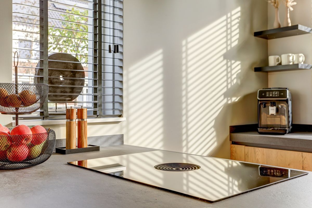 Uitgevoerd in een strak design en met hoogwaardige materialen, is deze keuken van alle gemakken voorzien. De inductiekookplaat met geïntegreerde afzuiging zorgt voor een open, ruimtelijk gevoel zonder hinderlijke afzuigkap. Daarnaast beschikt de keuken over een oven en een magnetron, een ingebouwde vaatwasser en een royale koelkast. Dankzij de slimme indeling van kasten en lades is er volop opbergruimte, waardoor alles altijd netjes en overzichtelijk blijft.