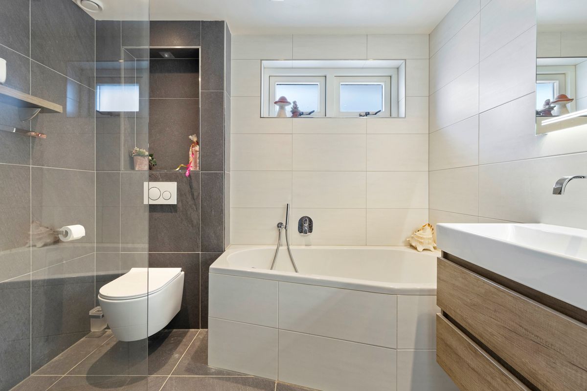 De luxe badkamer is compleet ingericht met ligbad, inloopdouche met regendouche, dubbele wastafel, wandcloset, vloerverwarming en inbouwspots. Een raam zorgt voor natuurlijk daglicht.