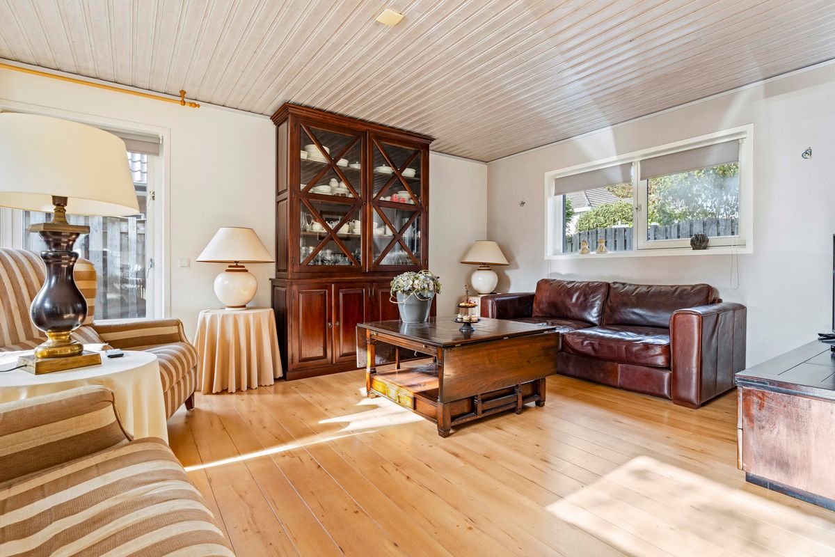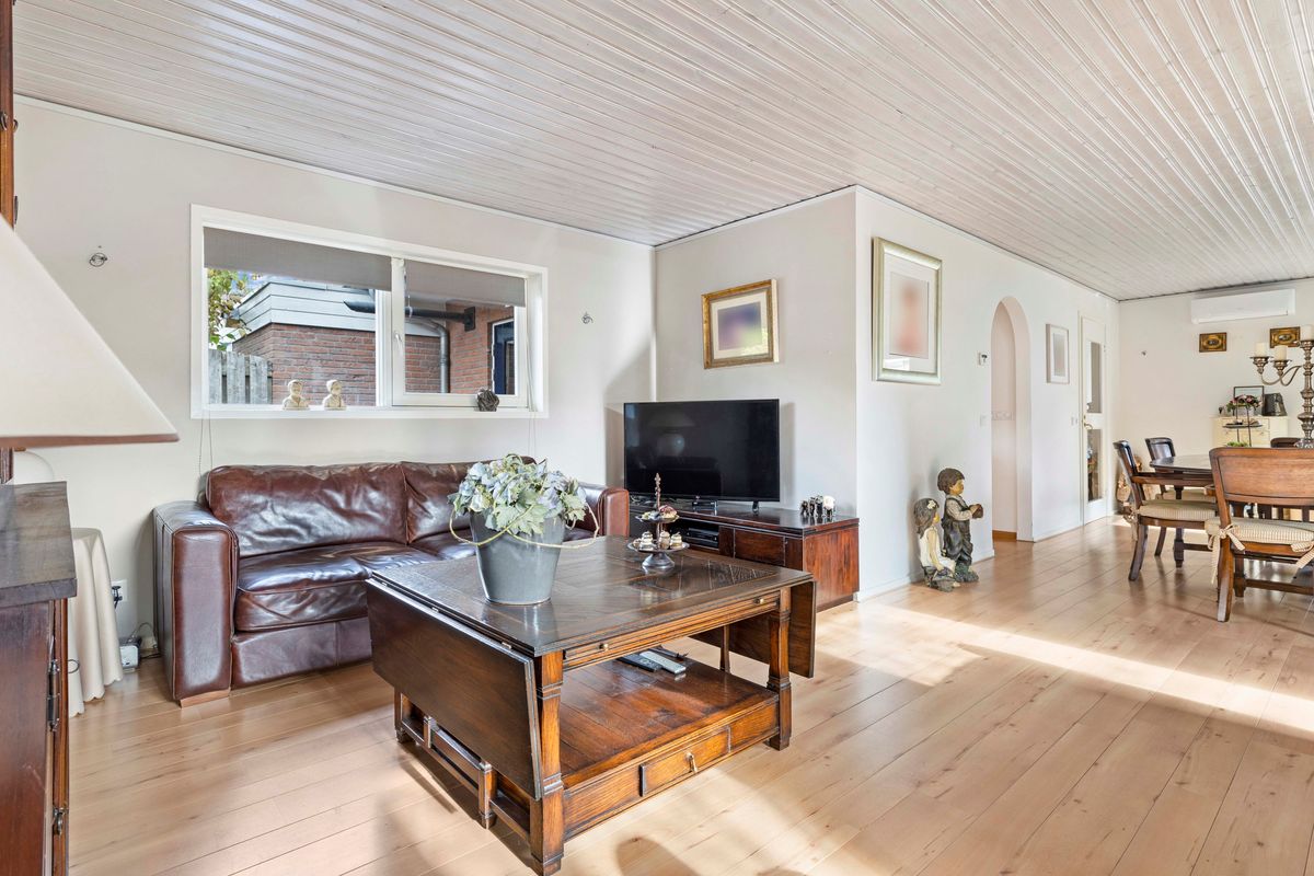 De lichte woonkamer van ca. 40 m² is een heerlijke leefruimte met grote ramen, een prettige indeling en airconditioning. Aan de voorzijde bevindt zich het eetgedeelte met ruimte voor een royale eettafel; aan de achterzijde het zitgedeelte met zicht op de tuin.