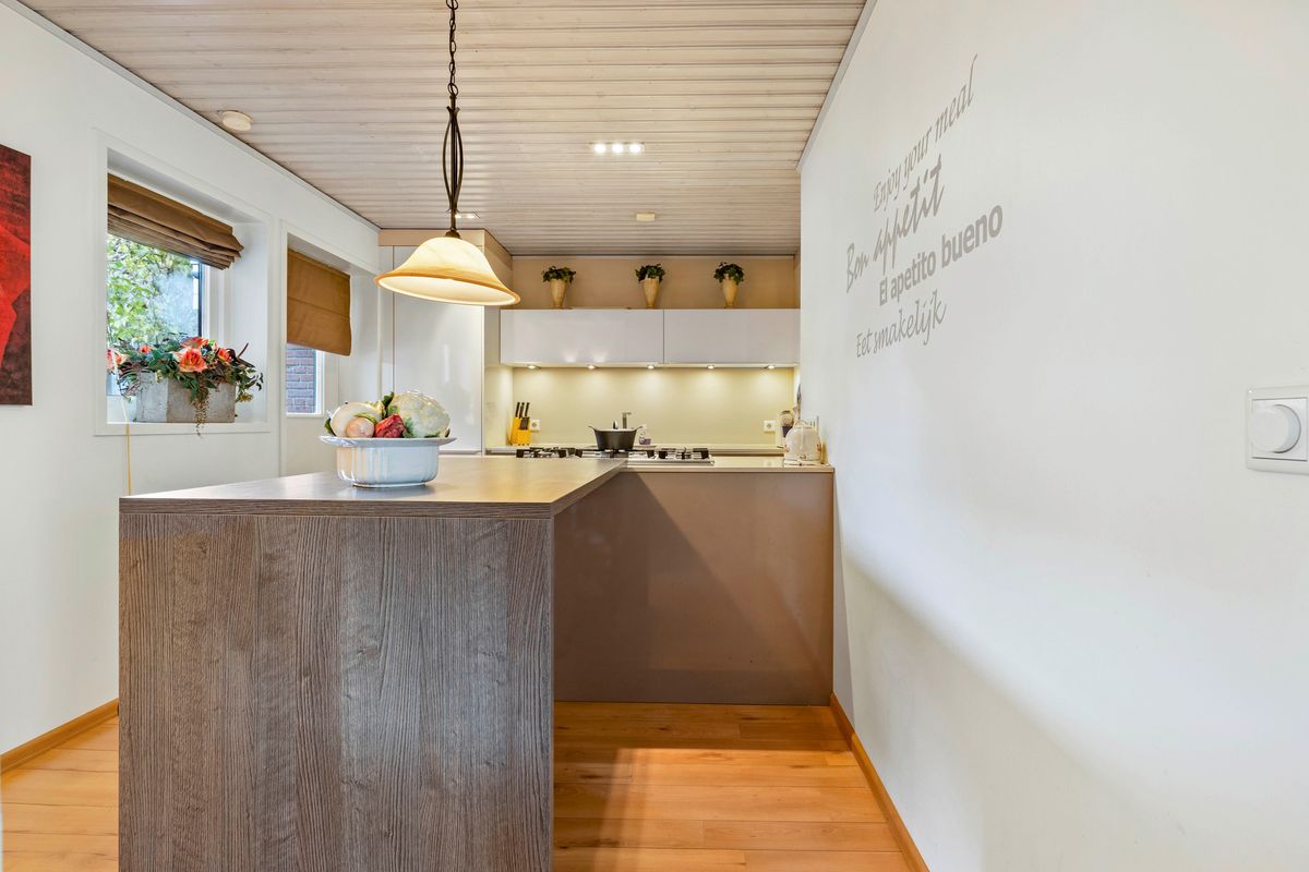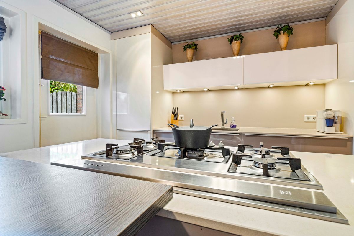 De moderne woonkeuken met kookeiland en natuurstenen werkblad is compleet uitgerust met o.a. een 5-pits gaskookplaat, inbouwafzuigkap, vaatwasser, combi-oven/magnetron en koelkast.