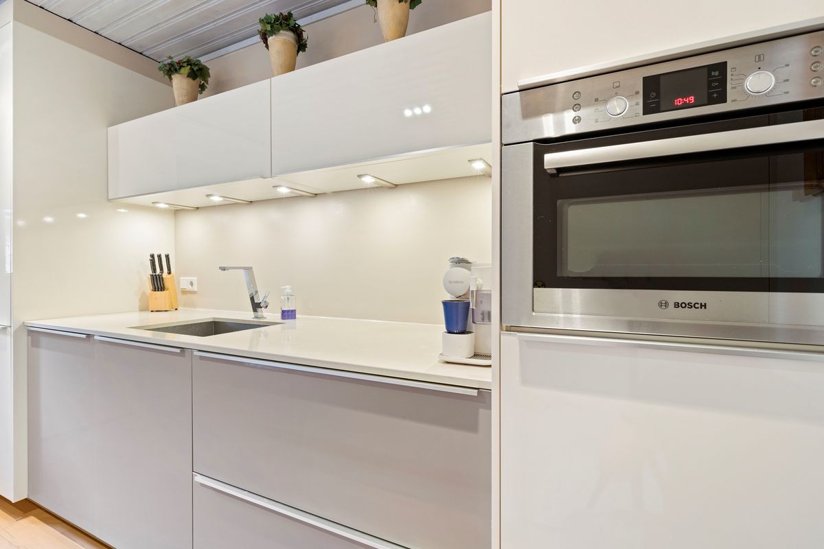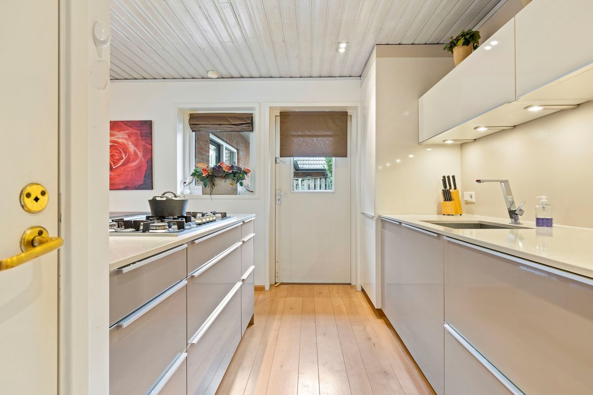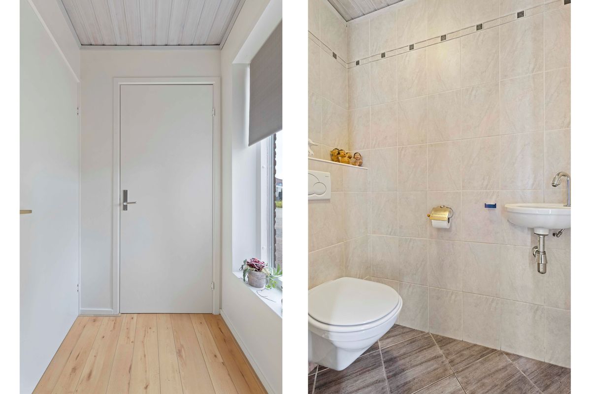 De bijkeuken biedt plaats aan de wasapparatuur en geeft toegang tot de verwarmde inpandige garage met tegelvloer.