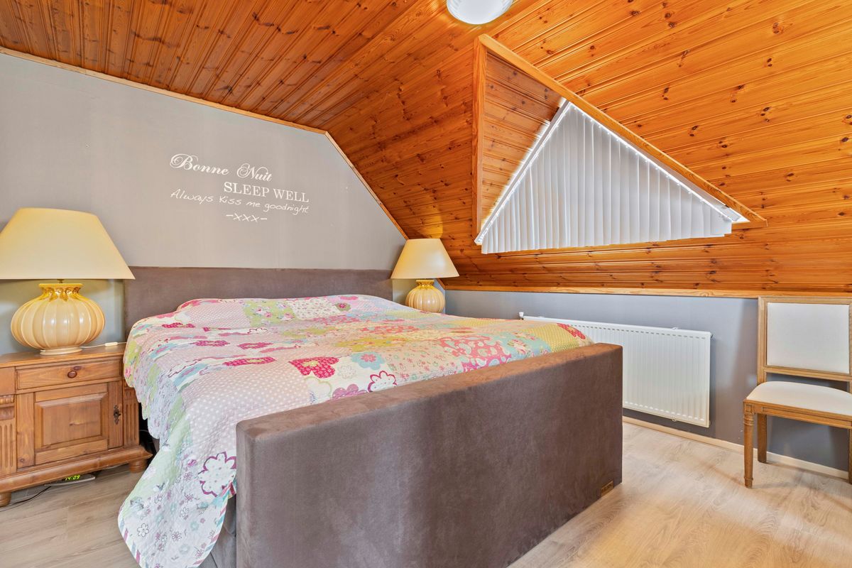 De overloop met airco leidt naar vier slaapkamers, elk met laminaatvloer en praktische inbouwkasten. De grootste slaapkamer heeft een balkon en dakkapel, terwijl andere kamers beschikken over extra bergruimte onder de schuine kap.