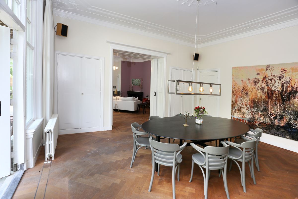 • Begane grond: statige ontvangsthal met trappenhuis, televisiekamer, grote woonkamer met uitzicht op de zonnige achtertuin, en suite met eetkamer met openslaande deuren naar het terras, ruime woonkeuken, bijkeuken en doorgang naar de garage. Het voorhuis is ingericht als woonkamer, slaapkamer en keukenruimte met douche en toilet.
