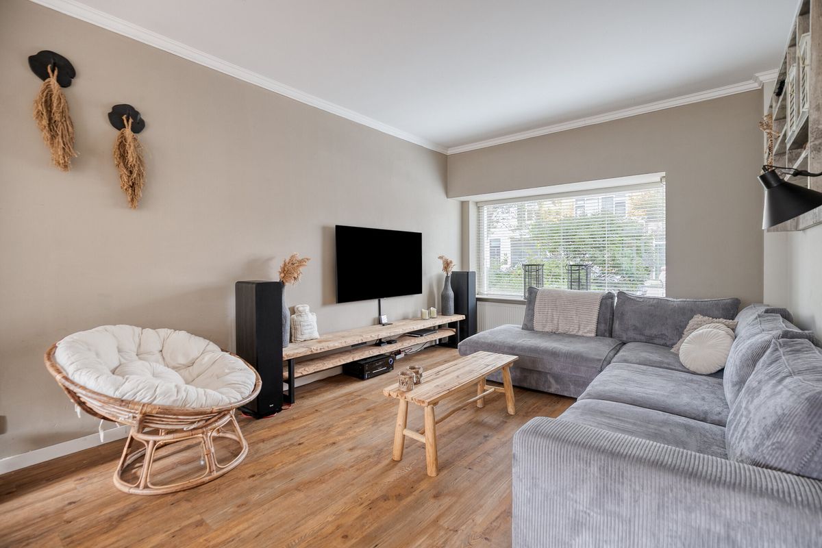 De woonkamer is een heerlijke ruimte om te vertoeven: licht, ruim en stijlvol afgewerkt. De hoge plafonds en strak gestucte wanden met sierlijsten versterken het gevoel van ruimte en elegantie. De pvc-vloer met vloerverwarming (2014) biedt niet alleen comfort, maar sluit ook perfect aan bij de moderne afwerking van het interieur. Via de openslaande deuren stap je zo de zonnige tuin in, waar het op elk moment van de dag goed toeven is.