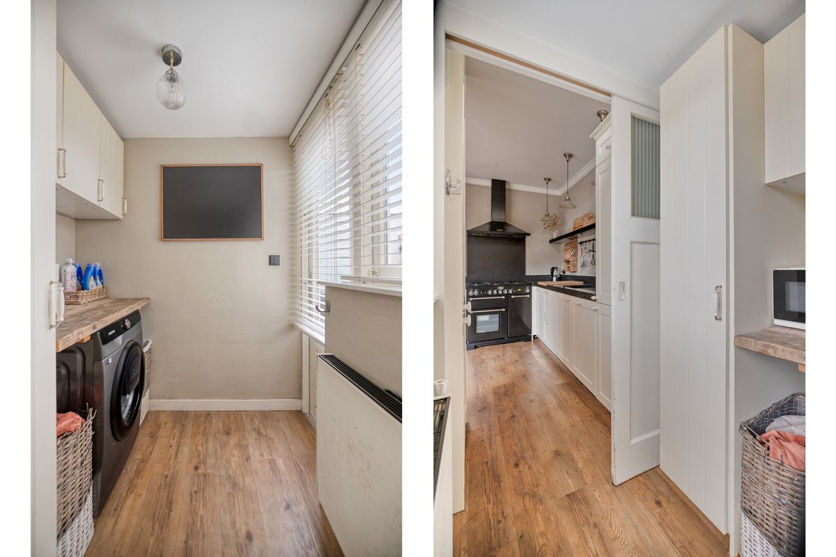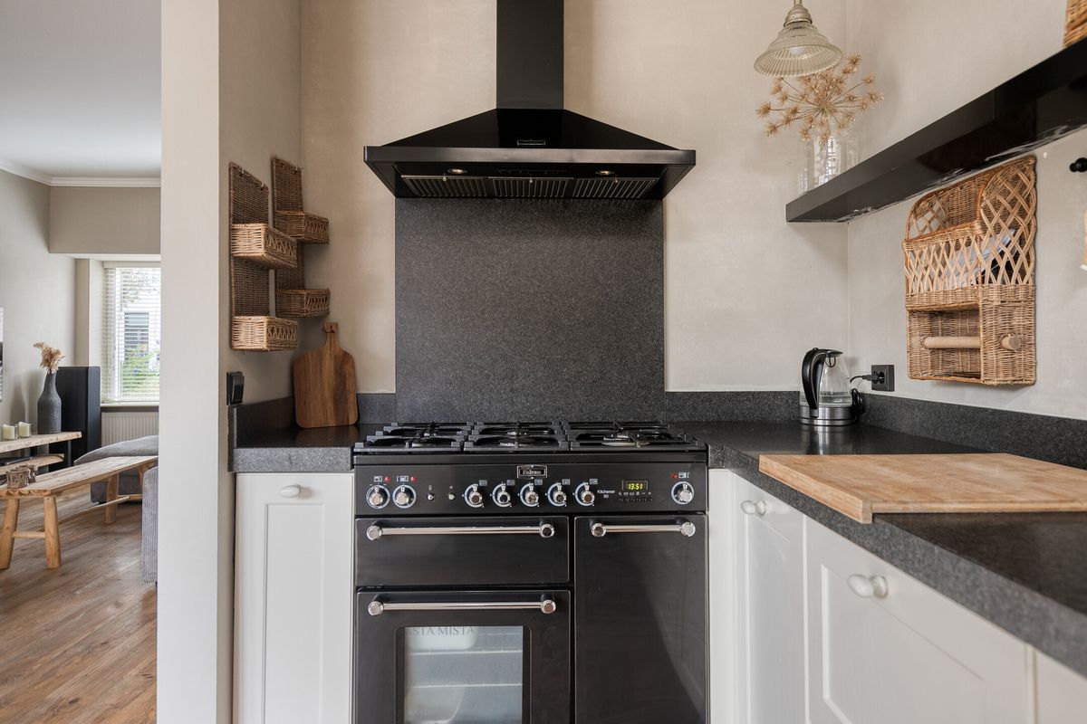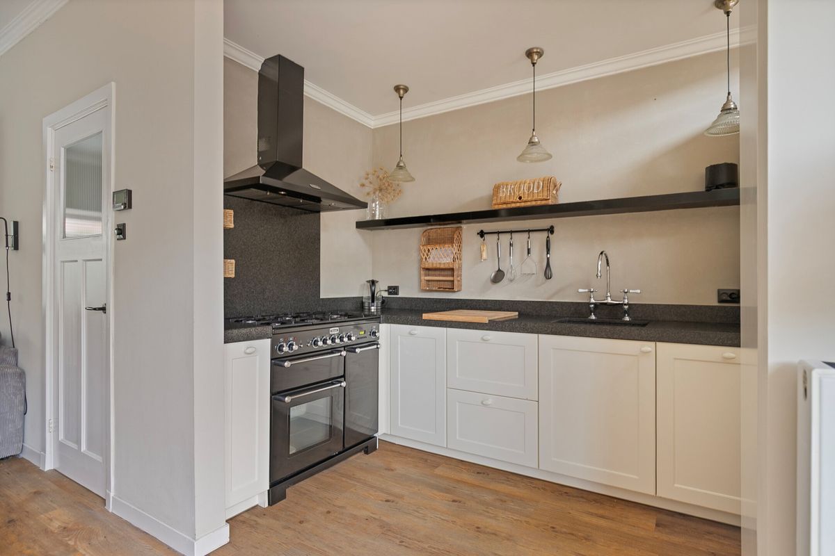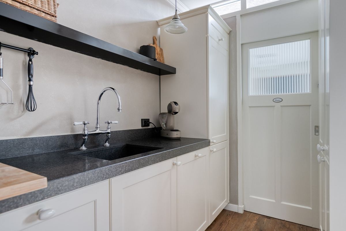 Aan de achterzijde bevindt zich de landelijke keuken, eveneens vernieuwd in 2014. Deze is voorzien van diverse inbouwapparatuur en een fraai natuurstenen aanrechtblad. De keuken vormt het hart van het huis en biedt voldoende ruimte. Aansluitend bevindt zich de bijkeuken, met witgoedopstelling en een extra deur naar de tuin – praktisch en stijlvol tegelijk.