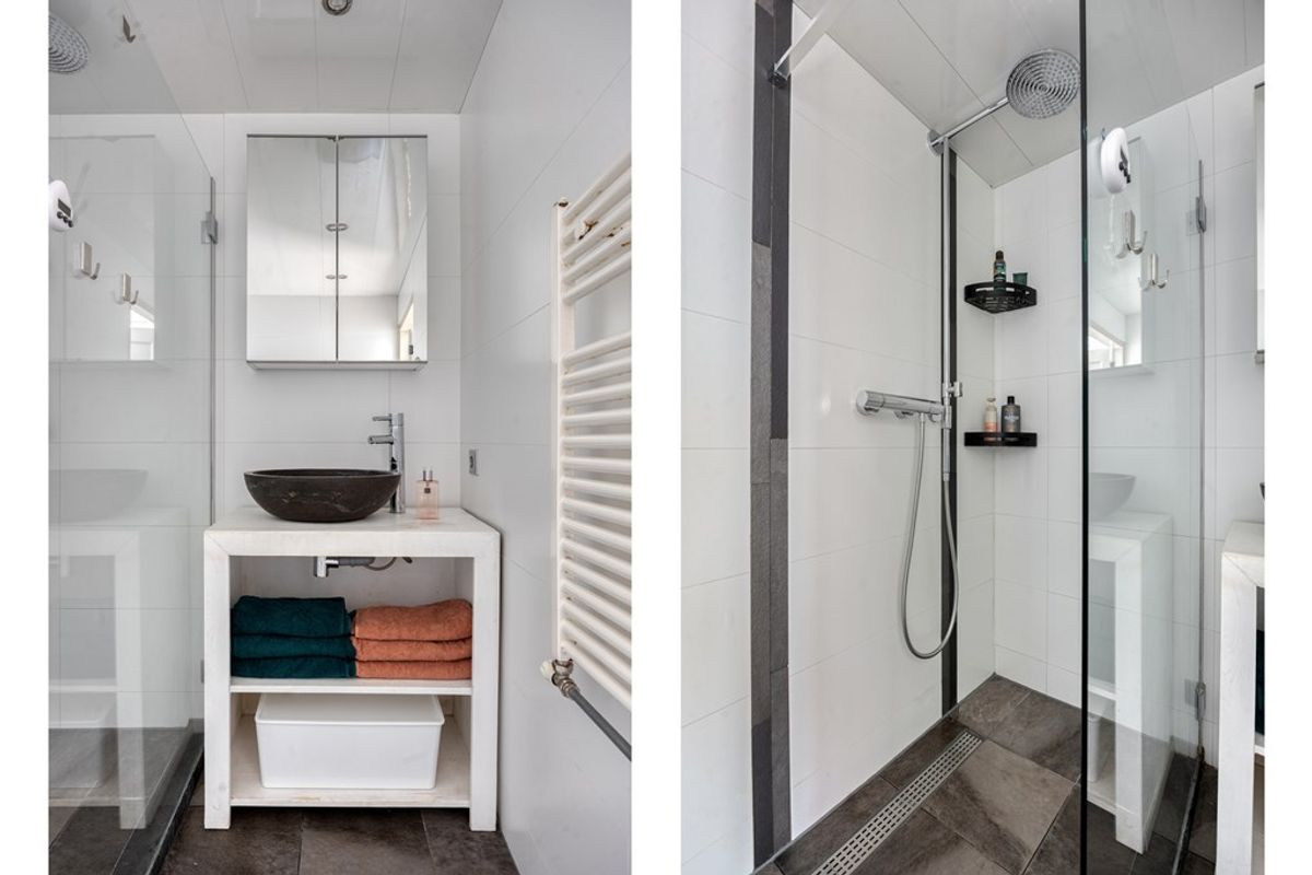 De badkamer is netjes verzorgd en voorzien van een douche, een wastafel met spiegel en toilet. Alles is functioneel ingericht en praktisch in gebruik. Daarnaast beschikt het appartement op de begane grond over een verrassend grote berging, ideaal voor het stallen van fietsen, het opbergen van seizoensspullen of andere extra bergruimte die altijd welkom is.